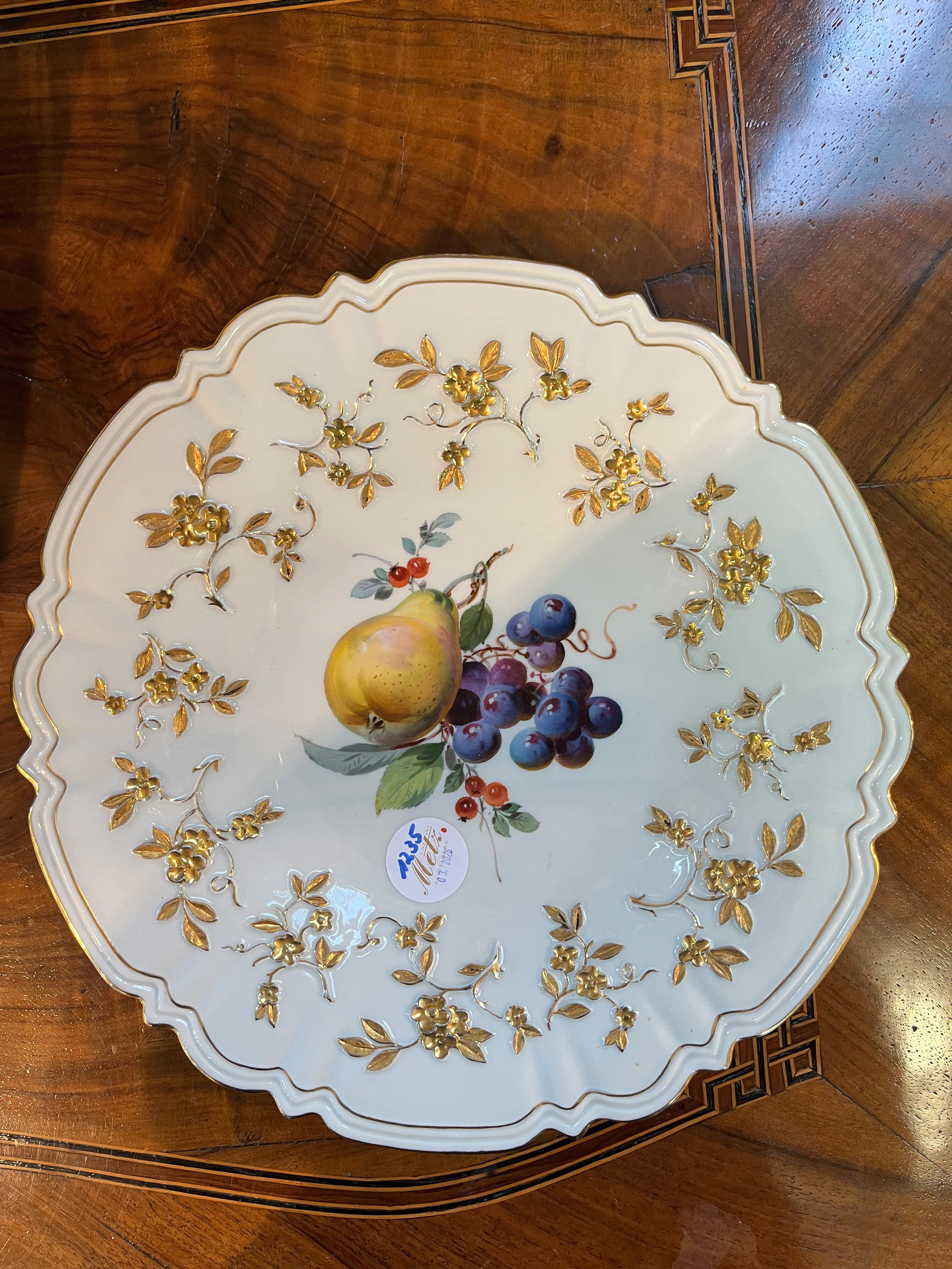- Katalog-Nr: 1235Runde Prunkplatte. Meissen Pfeifferzeit 1924–34. Porzellan, mit Floralrelief, gold gehöht und bunt bemalt mit Obstbouquet; verso unterglasurblaue Schwertermarke, D=29,5 cm.o.L.