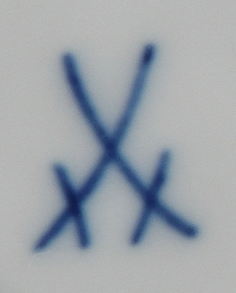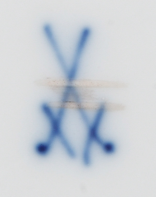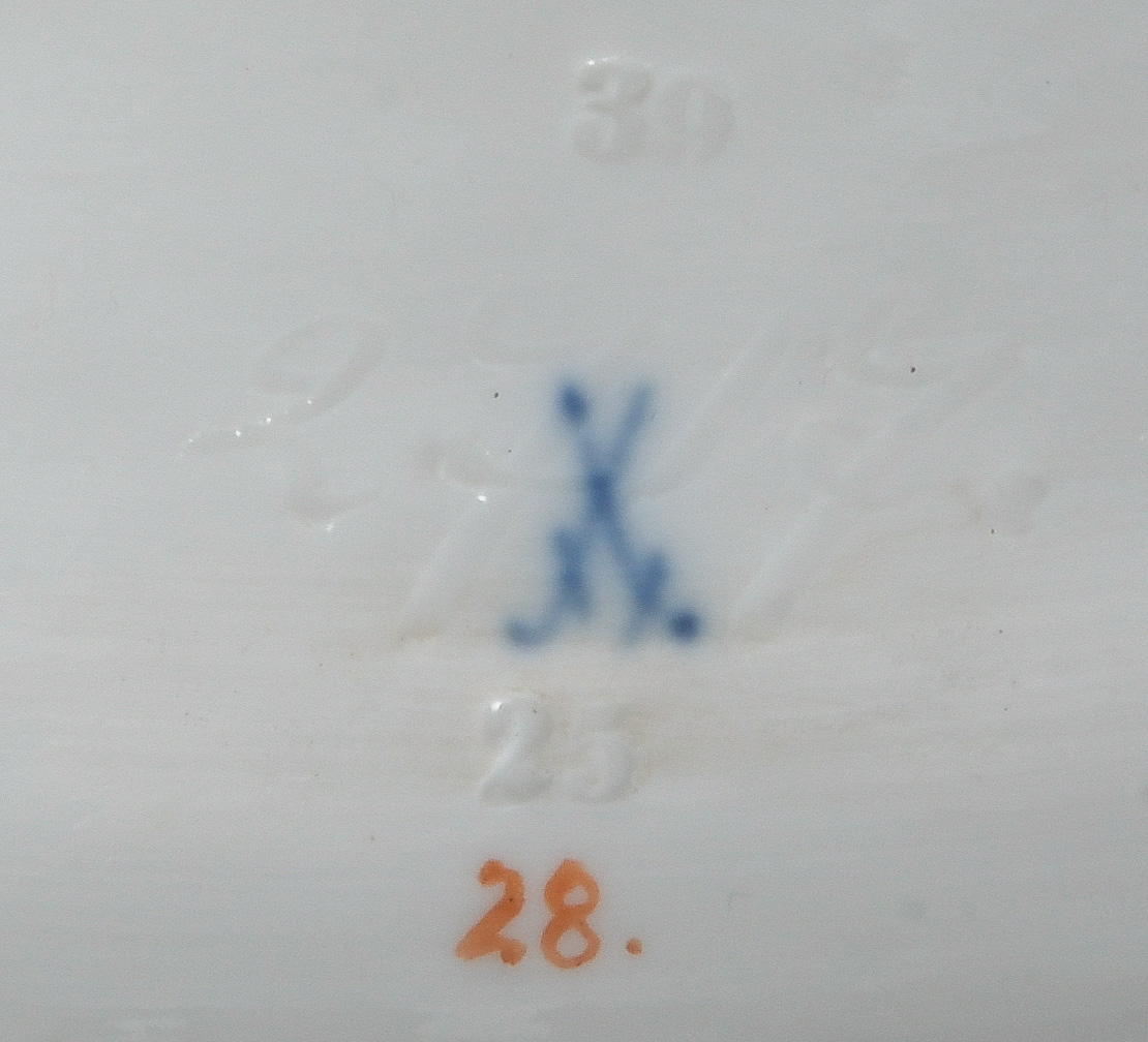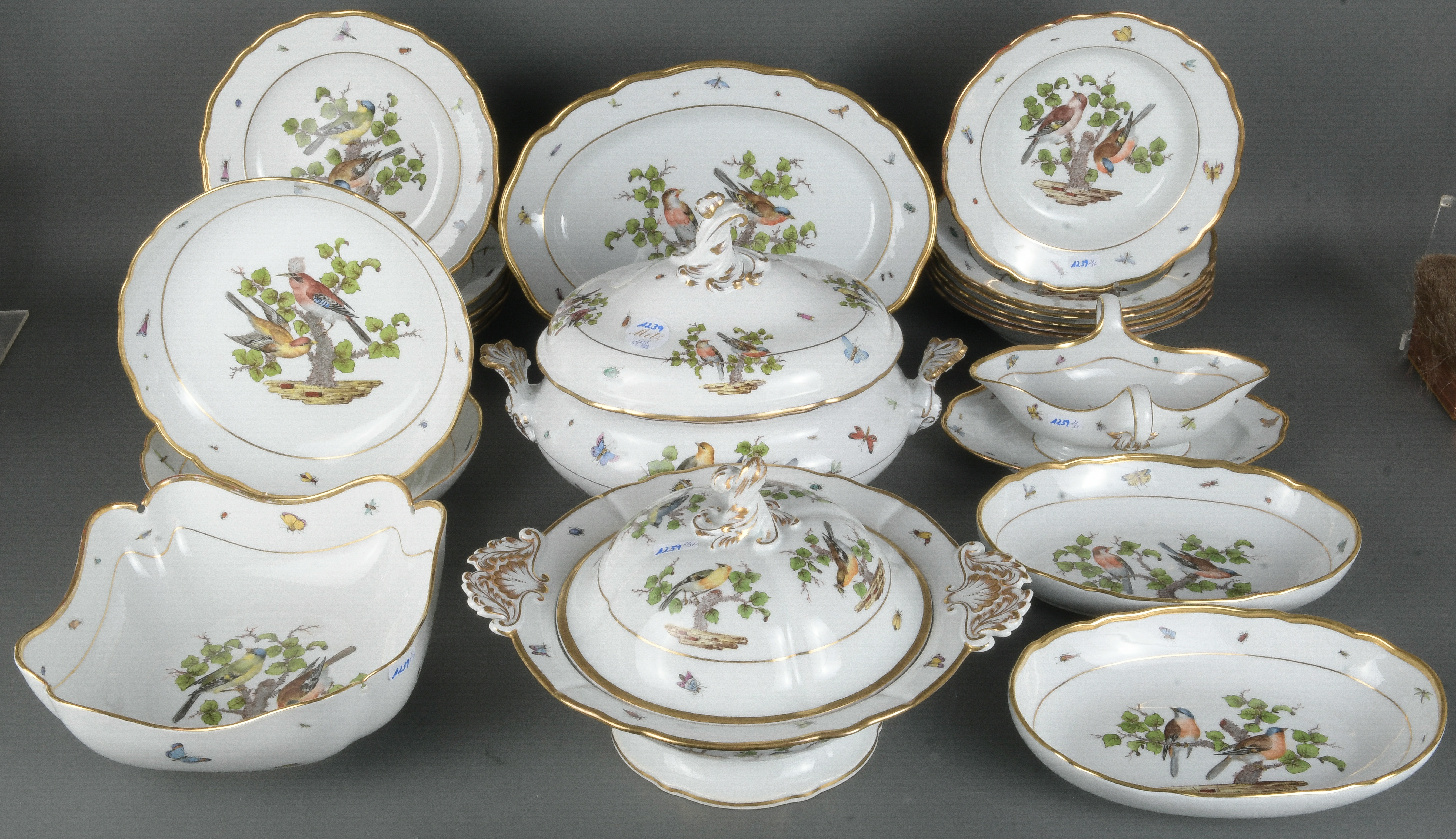 - Katalog-Nr: 123921-tlgs. Prunkservice. Meissen Pfeifferzeit 1924–34. Porzellan, exzellent bunt bemalt mit heimischen Vögeln auf Ästen, umgeben von Insekten, Ränder gold gesäumt; am Boden unterglasurblaue Schwertermarke. Bestehend aus: Sechs Speiseteller (D=je 24,5 cm), sechs Suppenteller (D=je 24 cm), eine Saucière (H=9,5 cm, B=24 cm, T=19 cm), eine große ovale Terrine (H=26 cm, B=35 cm, T=22 cm), eine ovale Platte (35 x 25 cm), eine runde Gemüseschüssel mit Deckel (H=18 cm, D=27 cm), eine quadratische Schüssel (H=10 cm, B=23 cm), ein Paar ovale Schalen (je 25 x 17 cm) und ein Paar runde Schalen (D=je 25 cm).o.L.