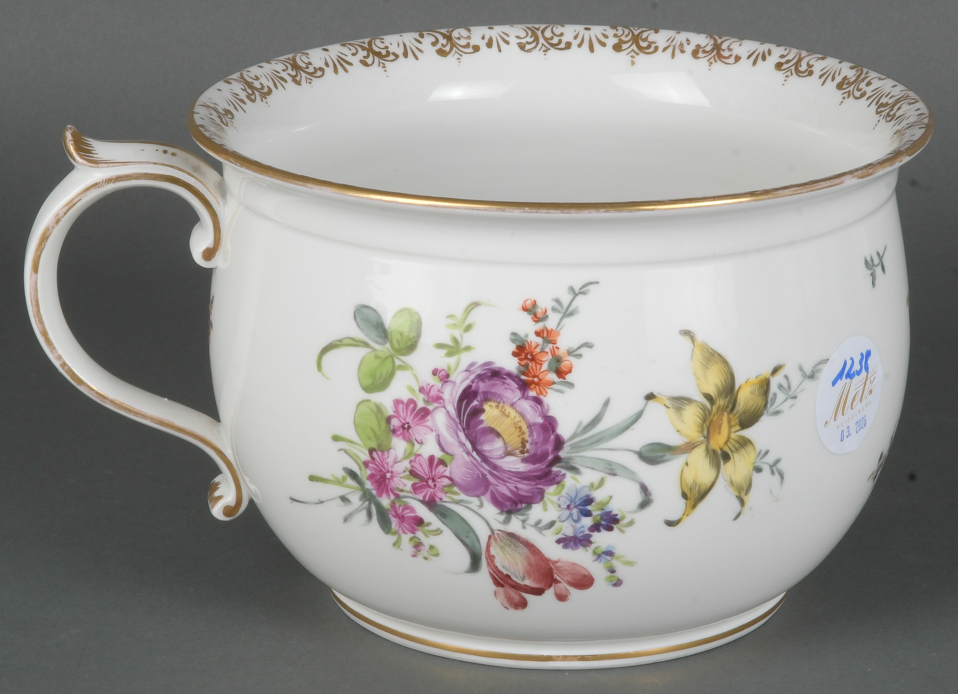 - Katalog-Nr: 1238Nachttopf. Meissen 19. Jh. Porzellan, bunt bemalt mit Blumenbouquet, umgeben von Streublumen, breite Goldspitzenbordüre; am Boden unterglasurblaue Schwertermarke mit zwei Schleifstrichen, H=13,2 cm, D=18,8 cm.o.L.