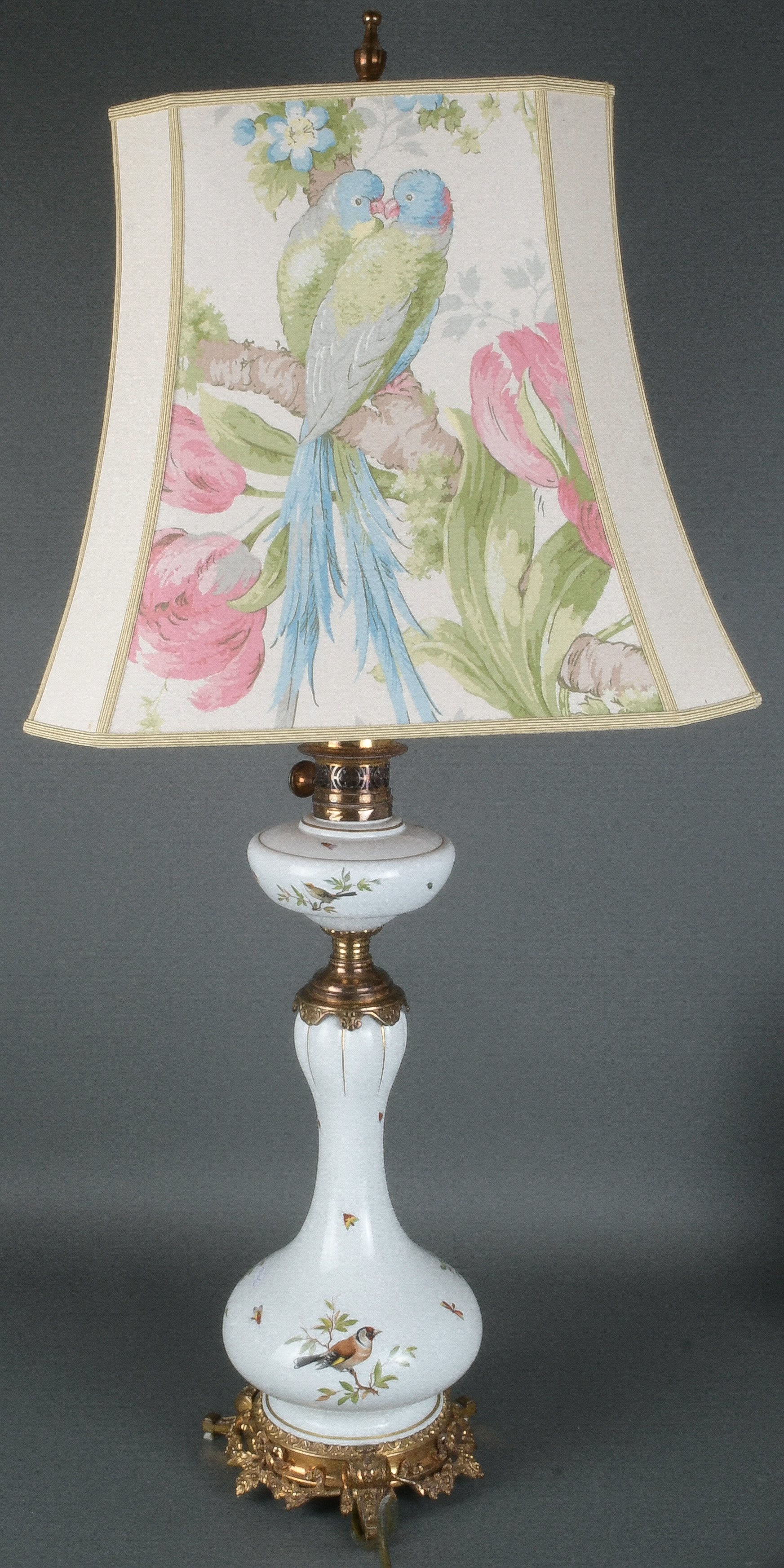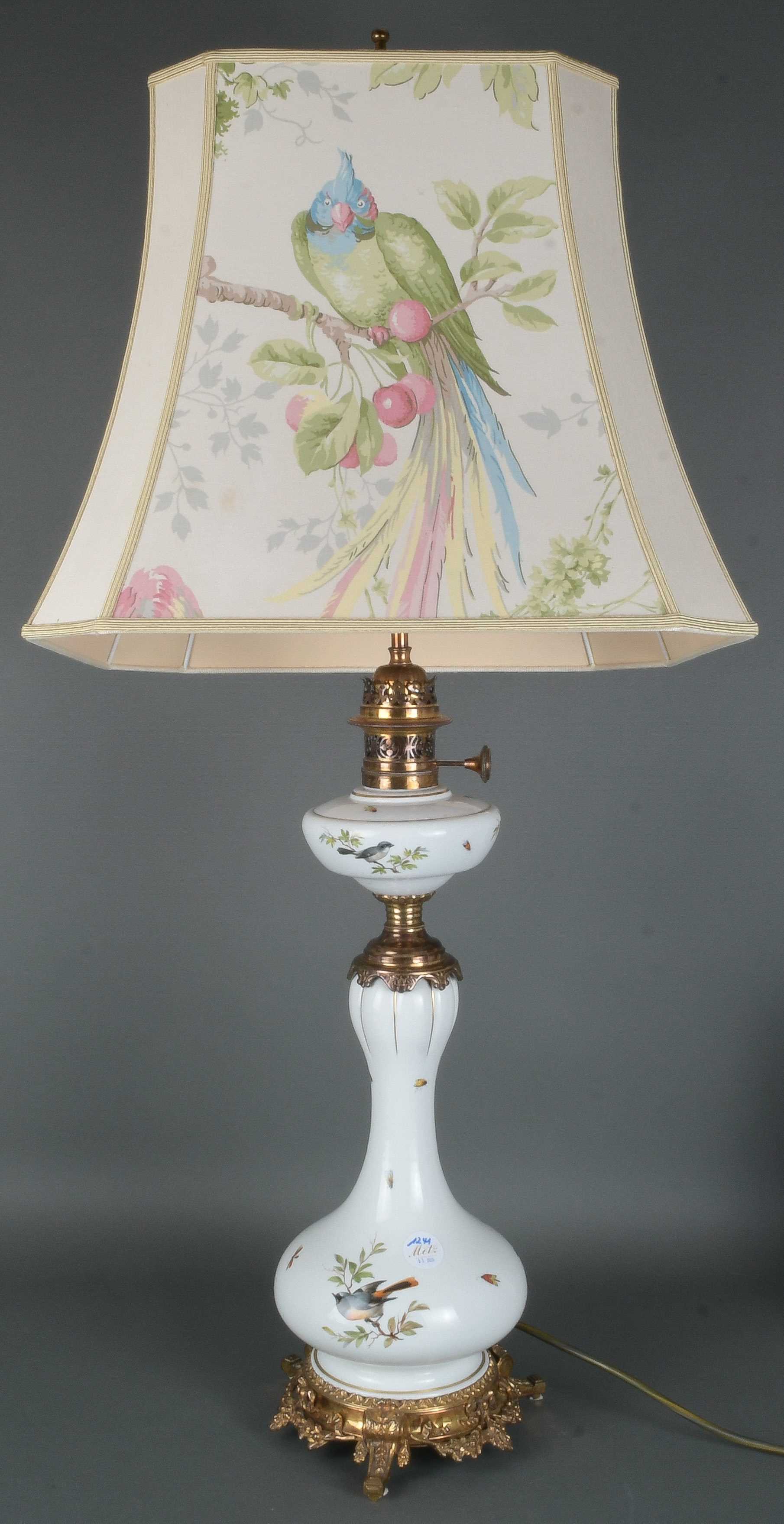 - Katalog-Nr: 1241Petroleumlampe. Meissen 19. Jh. Porzellan, bunt bemalt mit heimischen Vögeln auf Ästen, umgeben von Insekten; nachträglich elektrifiziert mit vierpassigem Schirm, H=50 / 96 cm. (Funktion ungeprüft)o.L.