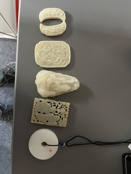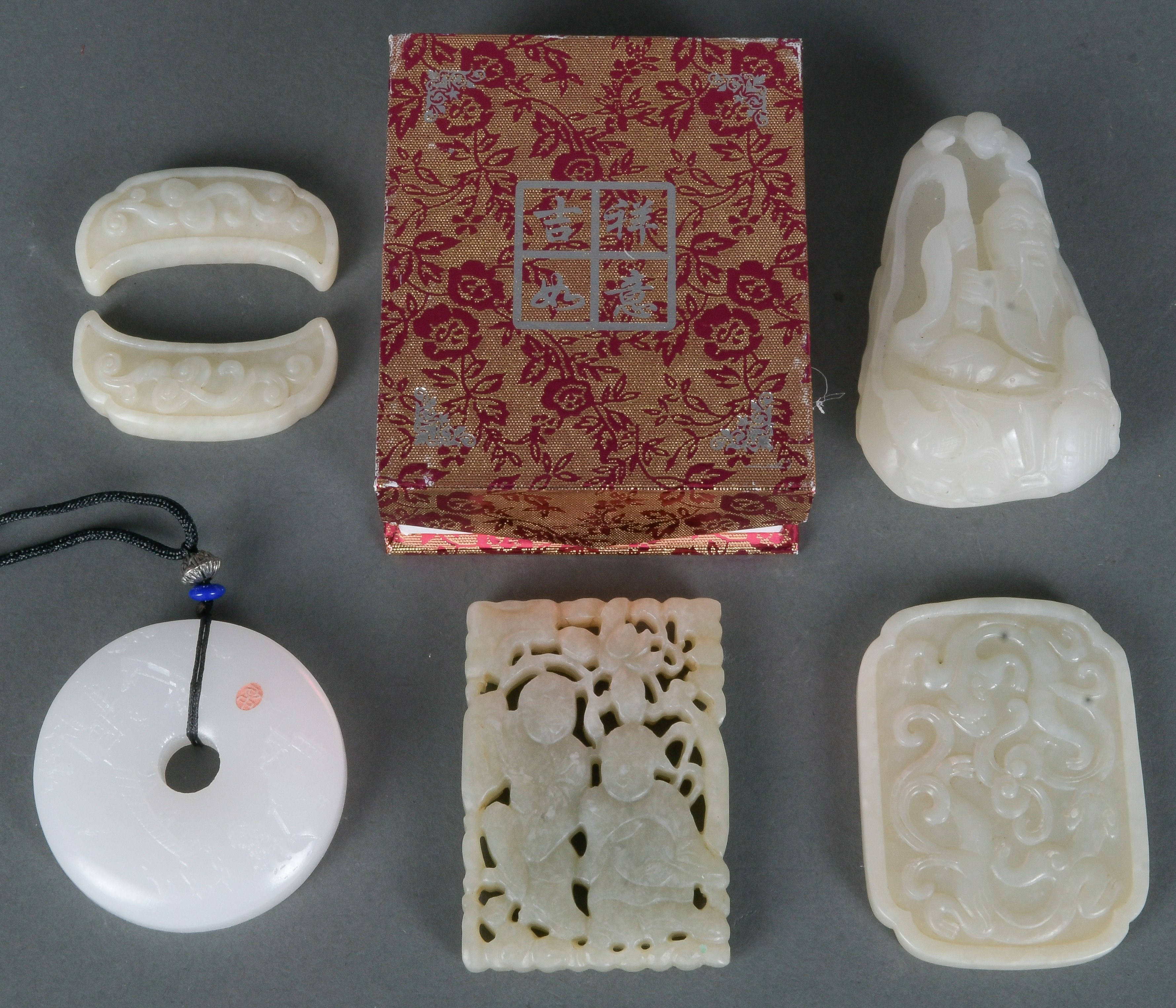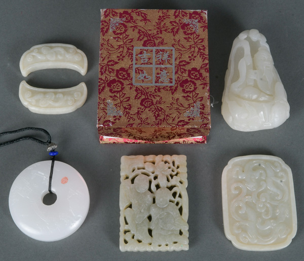 - Katalog-Nr: 1242Sechstlgs. Konvolut Jade. Asien. Darunter ein Anhänger (D=5,1 cm) und kleine Tafeln (6,1 x 4,8 / 6,4 x 4,5 cm).o.L.