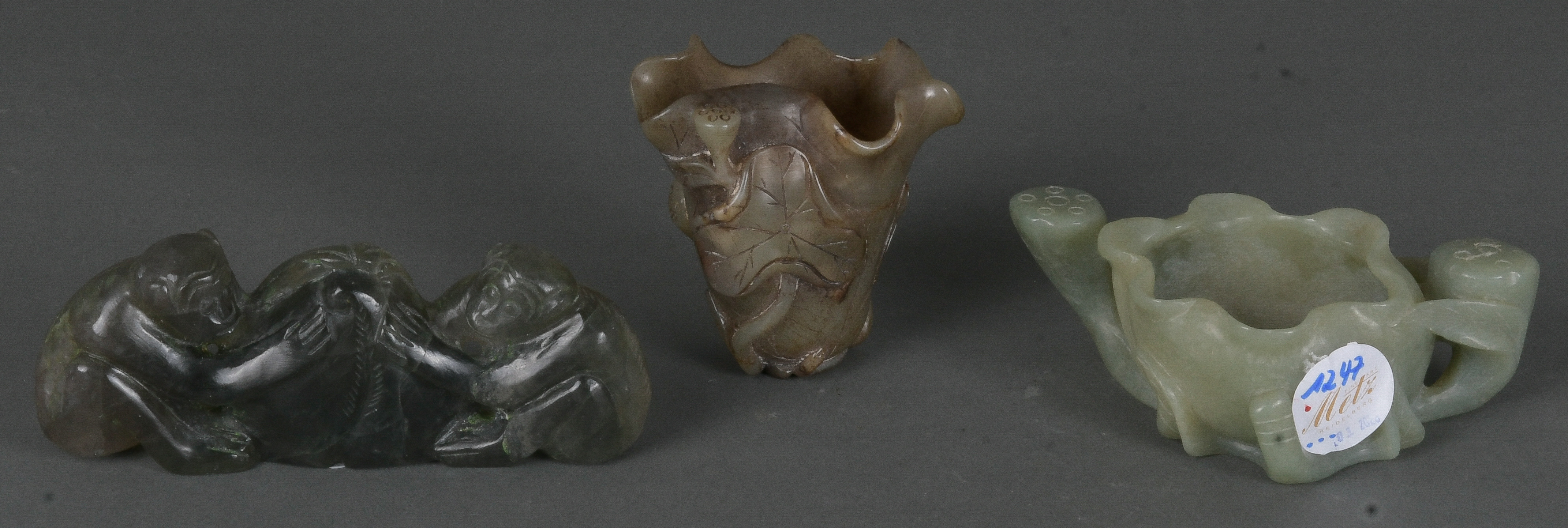 - Katalog-Nr: 1247Dreitlgs. Konvolut Jade. Asien. Bestehend aus: Zwei Vasen (H=4,1 / 8,1 cm) und ein Affenpaar (H=6 cm).o.L.
