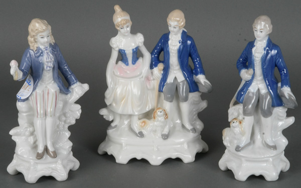- Katalog-Nr: 1232Dreitlgs. Konvolut Gräfenthal 20. Jh. Porzellan, bunt bemalt; am Boden gemarkt. Bestehend aus: Rokokopaar mit Spanielhund, sitzender Knabe und stehender Mann mit Stock, H=18 bis 18,5 cm.o.L.