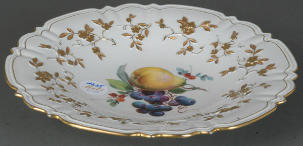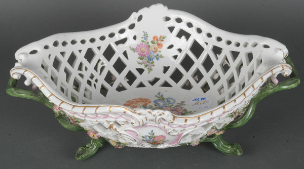 - Katalog-Nr: 1234Ovale Durchbruchsschale. Meissen 19. Jh. Porzellan, bunt bemalt mit Obstbouquet, gold gesäumt; verso unterglasurblaue Schwertermarke, H=6,5 cm, B=32 cm, T=24,5 cm.o.L.
