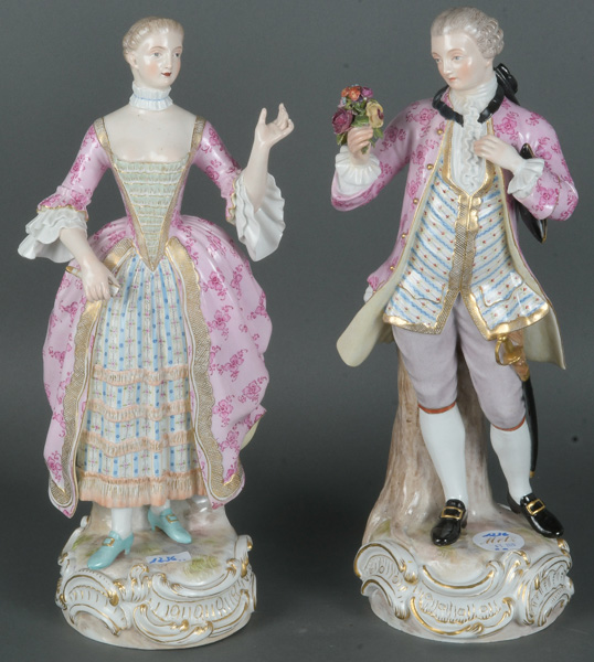 - Katalog-Nr: 1236Rokokopaar. Meissen 19. Jh. Je stehend auf rundem Rocaillesockel, gold gesäumt. Porzellan, bunt bemalt, teilweise mit Goldspitzenbordüre; am Boden unterglasurblaue Schwertermarke mit einem Schleifstrich, Modelle von J.C. Schönheit, H=je 36 cm. (best. / rest.)o.L.