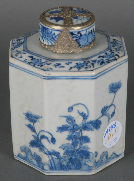 - Katalog-Nr: 1243Oktogonale Teedose. China. Porzellan, unterglasurblau bemalt mit Floraldekor; am Boden gemarkt, H=16 cm.o.L.