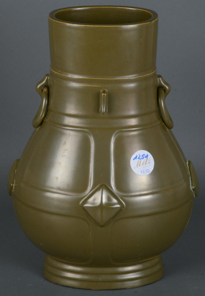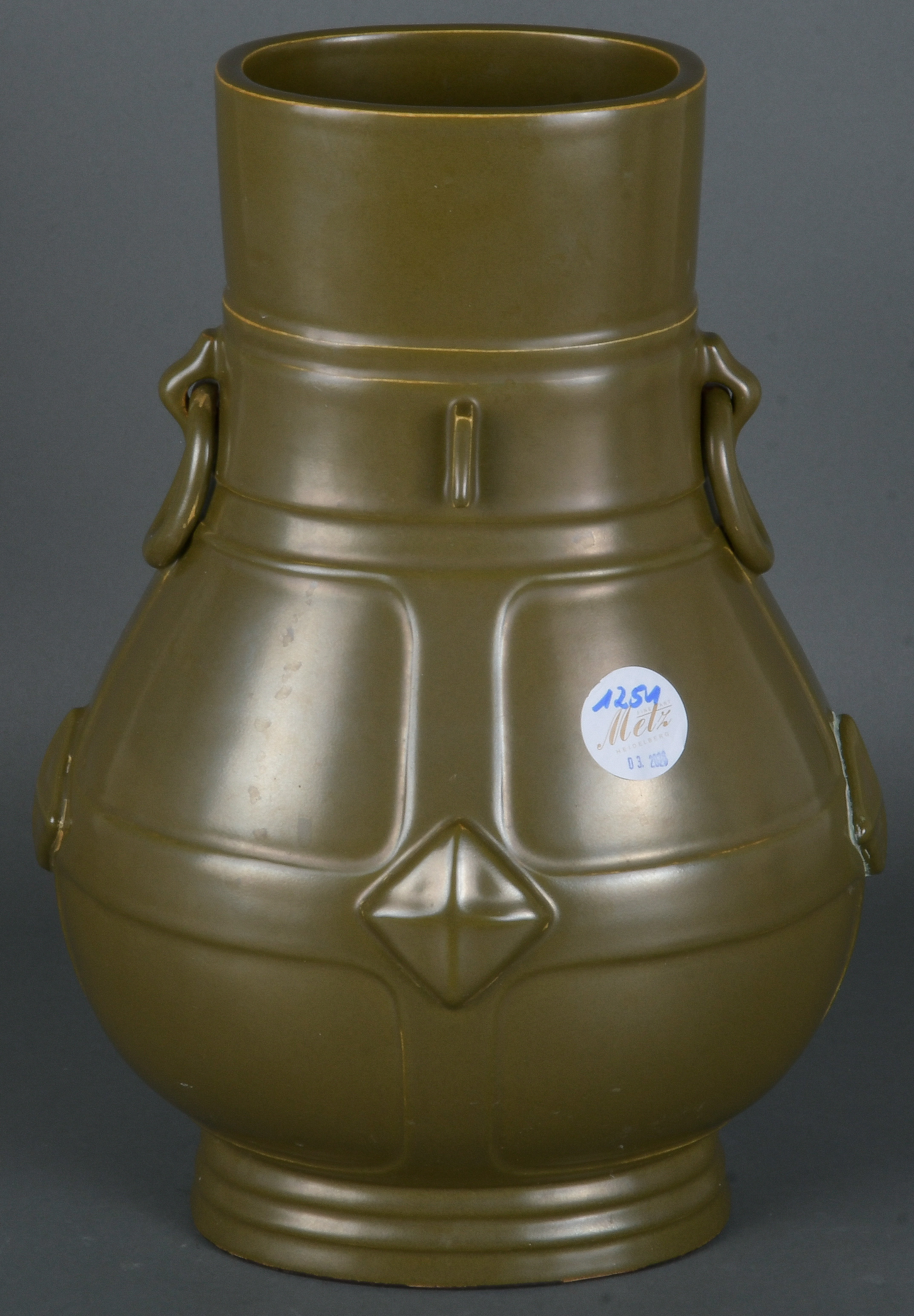 - Katalog-Nr: 1251Vase. Asien. Keramik, mit erhaben reliefierter Wandung, grün glasiert; am Boden Prägemarke, H=33,5 cmo.L.
