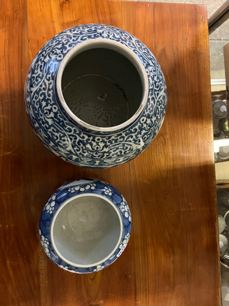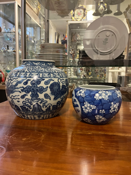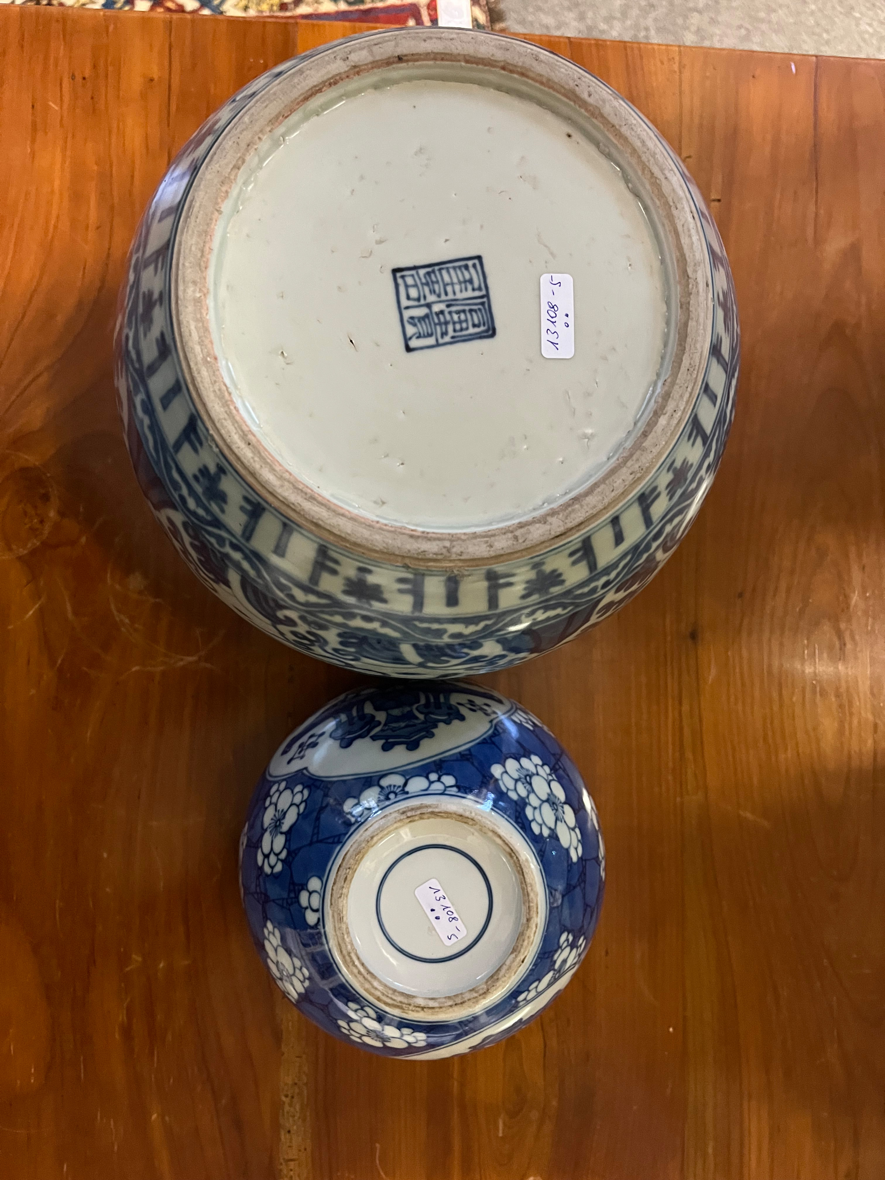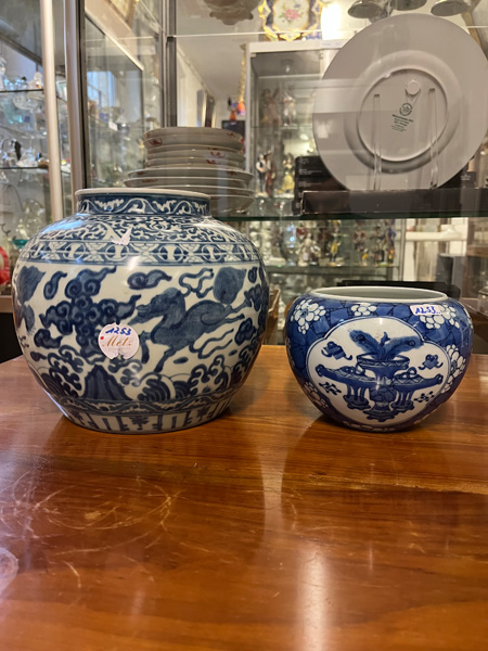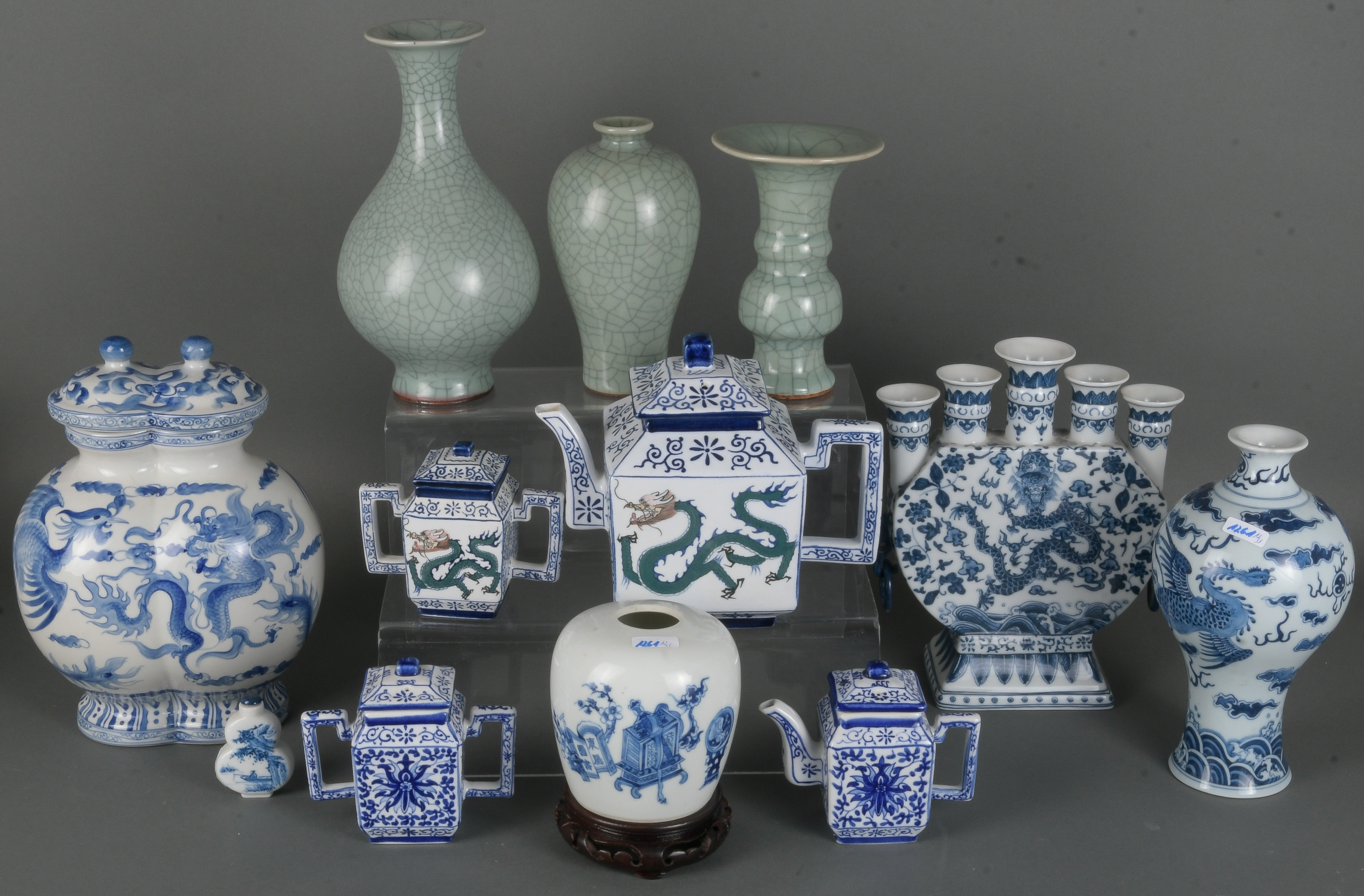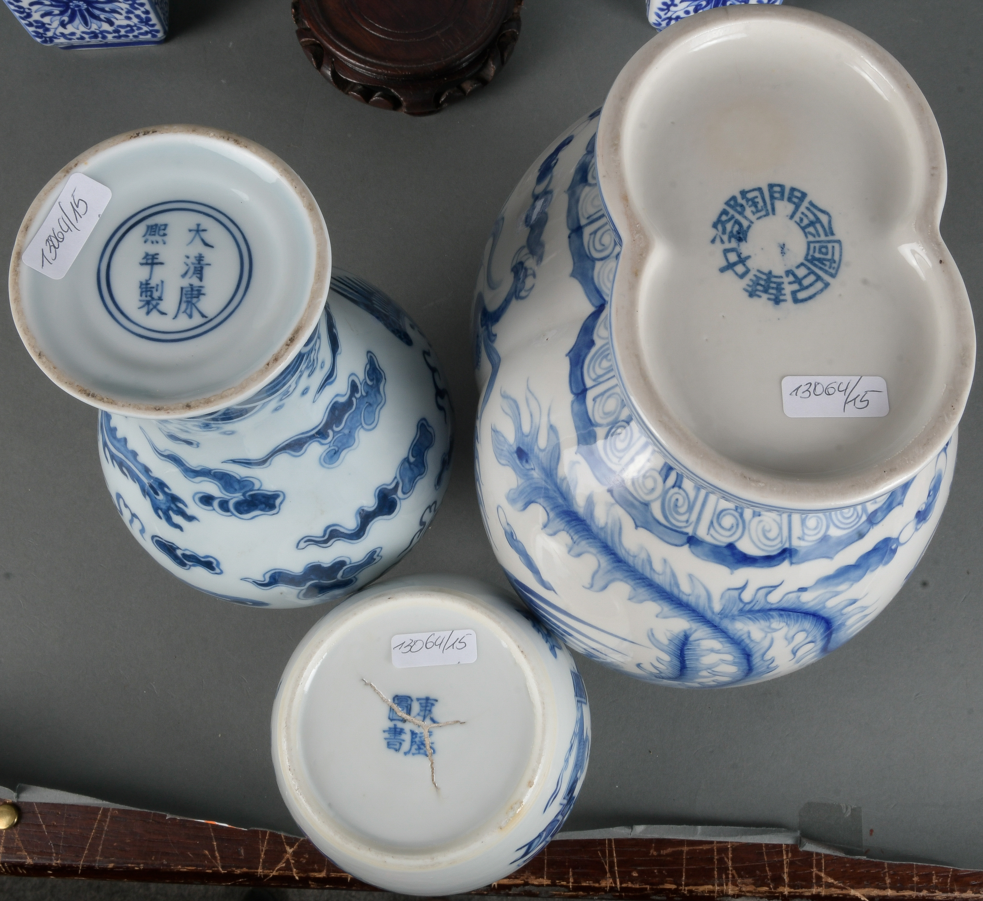 - Katalog-Nr: 1261Zwölftlgs. Konvolut Asiatika. Porzellan, unterglasurblau bemalt bzw. mit Craqueléglasur; teilw. am Boden gemarkt. Bestehend aus: Ein Flakon (H=6,5 cm), eine Doppelhenkelvase (H=27 cm), zwei Deckelgefäße (H=10,5 cm), zwei Kannen (H=10 / 16 cm) und sechs Vasen (H=10 bis 23,5 cm).o.L.