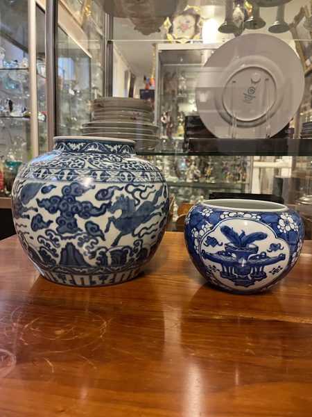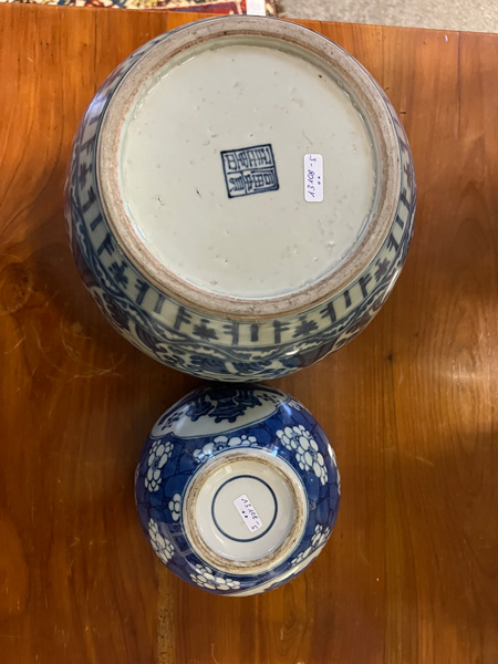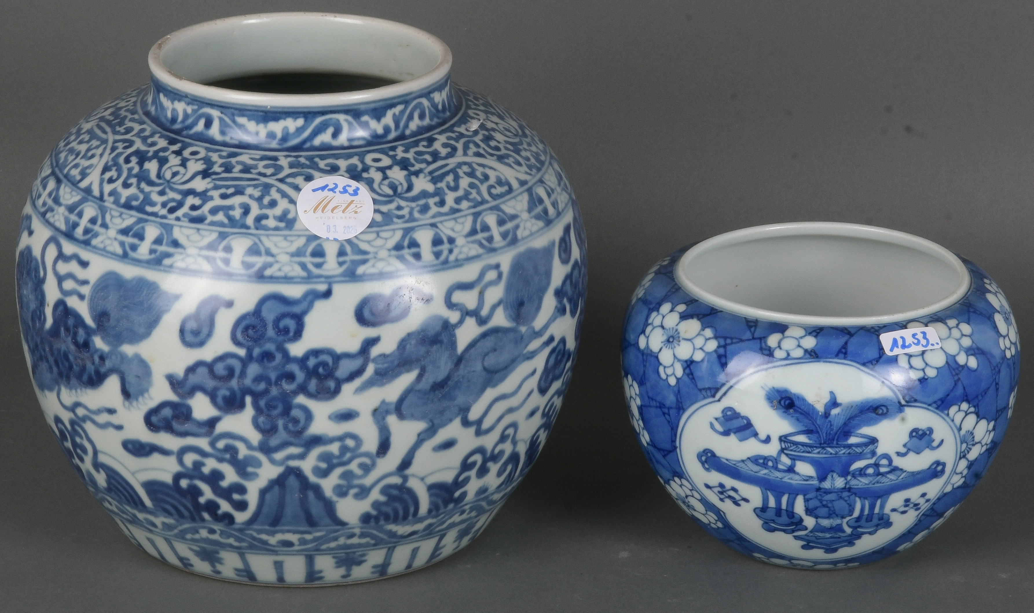 - Katalog-Nr: 1253Zwei Vasen. Asien. Porzellan, unterglasurblau bemalt; am Boden gemarkt, H=10,5 / 19,5 cm.o.L.