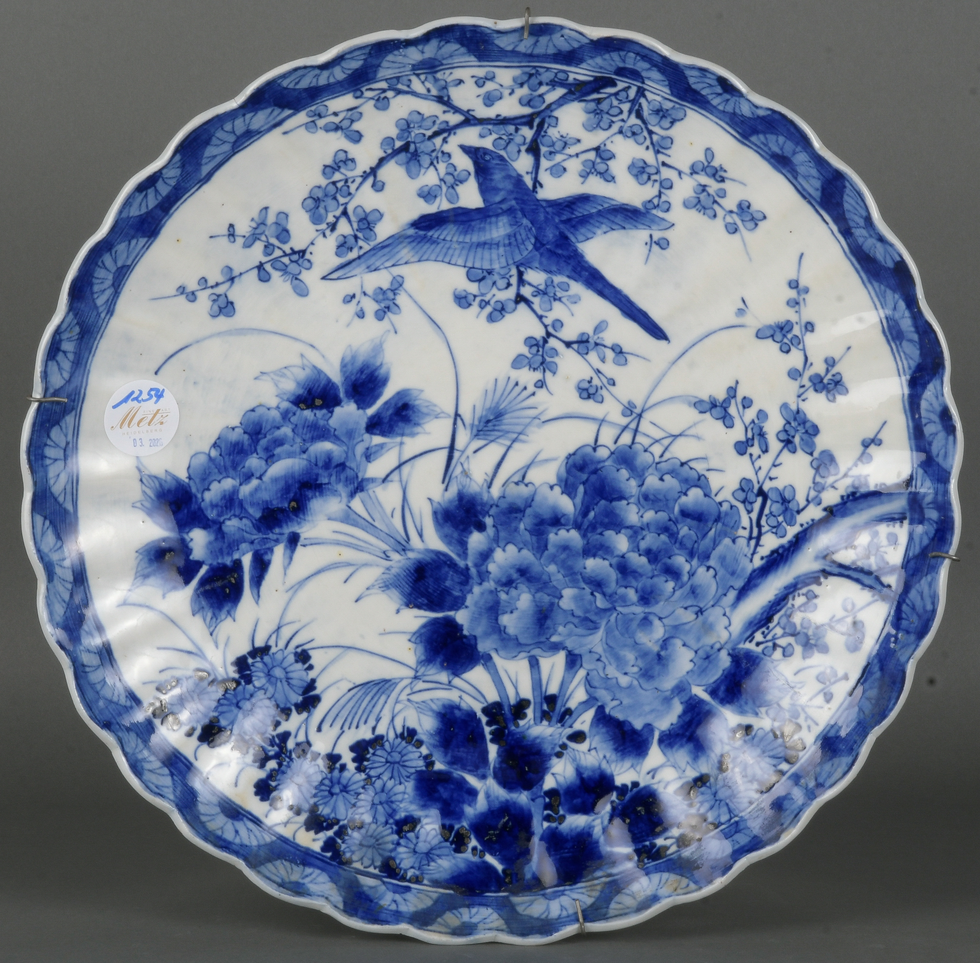 - Katalog-Nr: 1254Große runde Fächerplatte. Asien. Porzellan, unterglasurblau bemalt mit Pflanzen und Paradiesvogel; ohne Marke, D=36 cm.o.L.