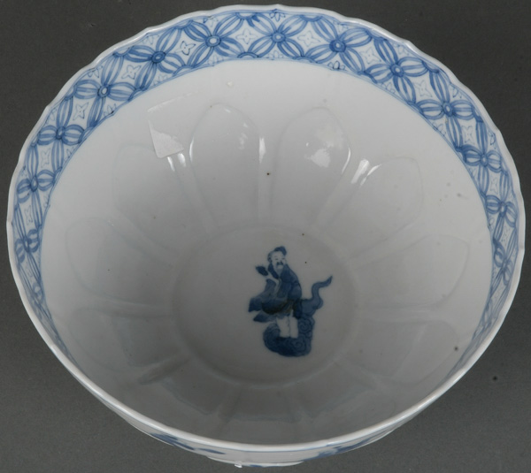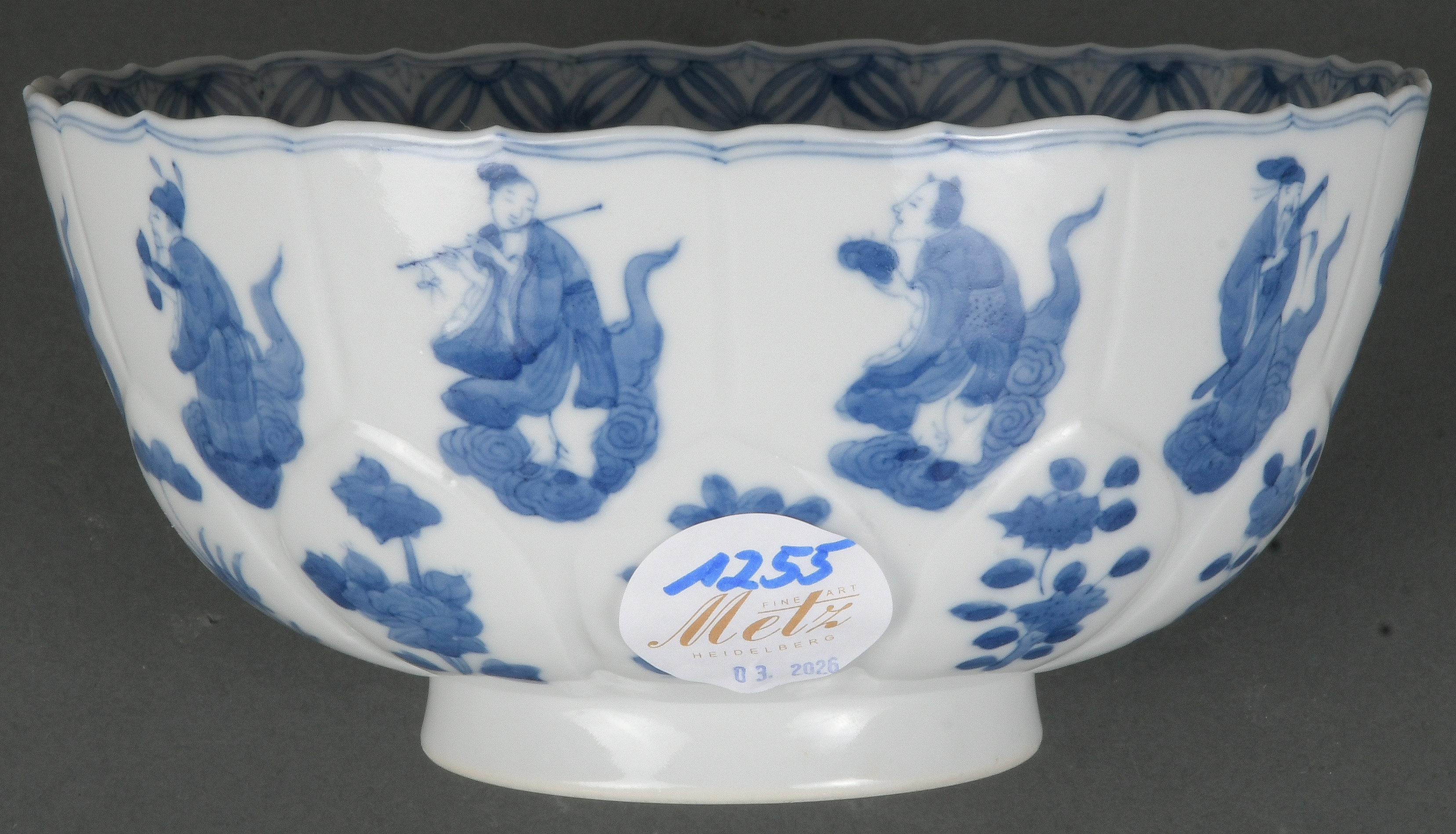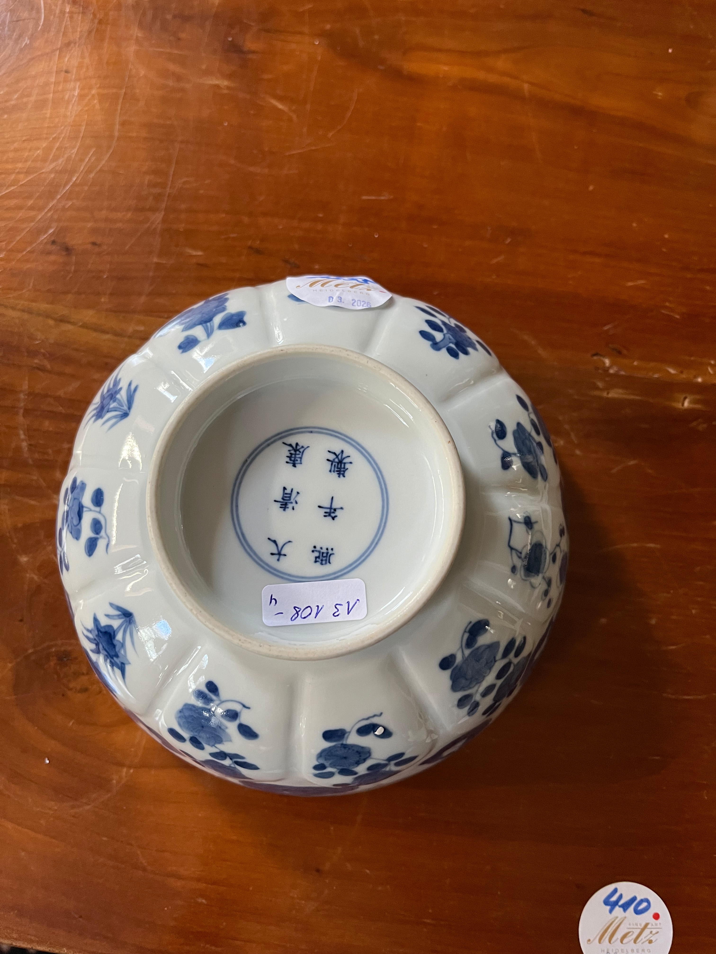 - Katalog-Nr: 1255Runde Kumme. Asien. Porzellan, unterglasurblau bemalt; am Boden gemarkt, H=8,5 cm, D=17 cm.o.L.