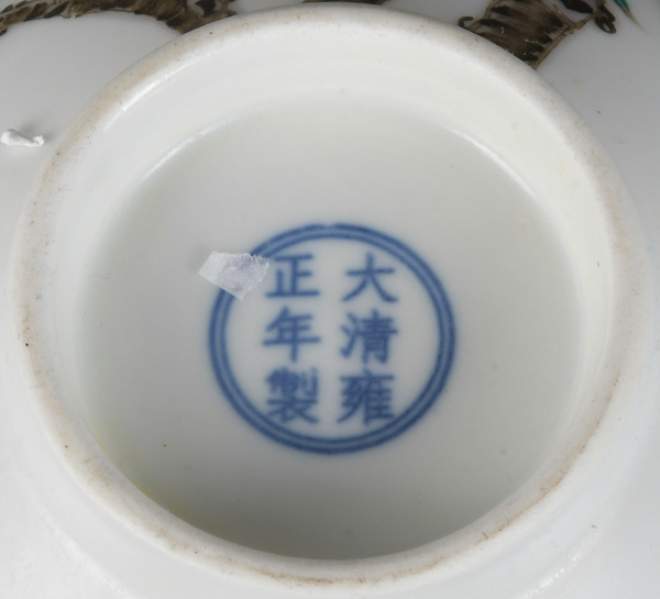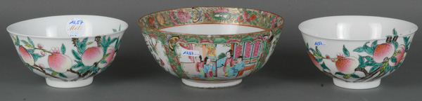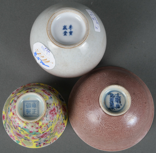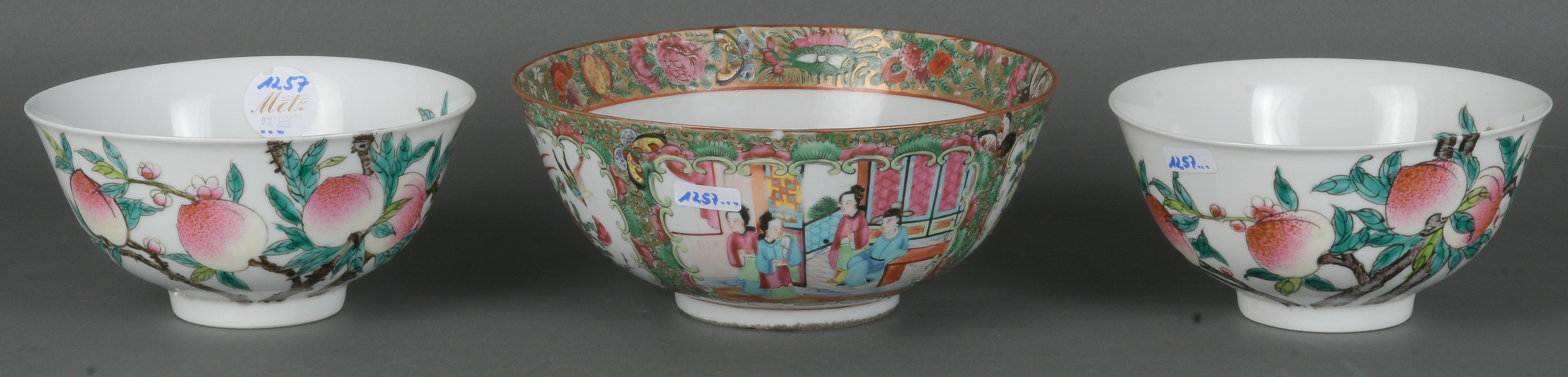 - Katalog-Nr: 1257Dreitlgs. Konvolut Asiatika. Porzellan, bunt bemalt; zwei Teile am Boden sign. Bestehend aus: Ein Paar Kummen (H=je 8,5 cm, D=je 17 cm) und eine weitere (H=9,2 cm, D=21 cm).o.L.