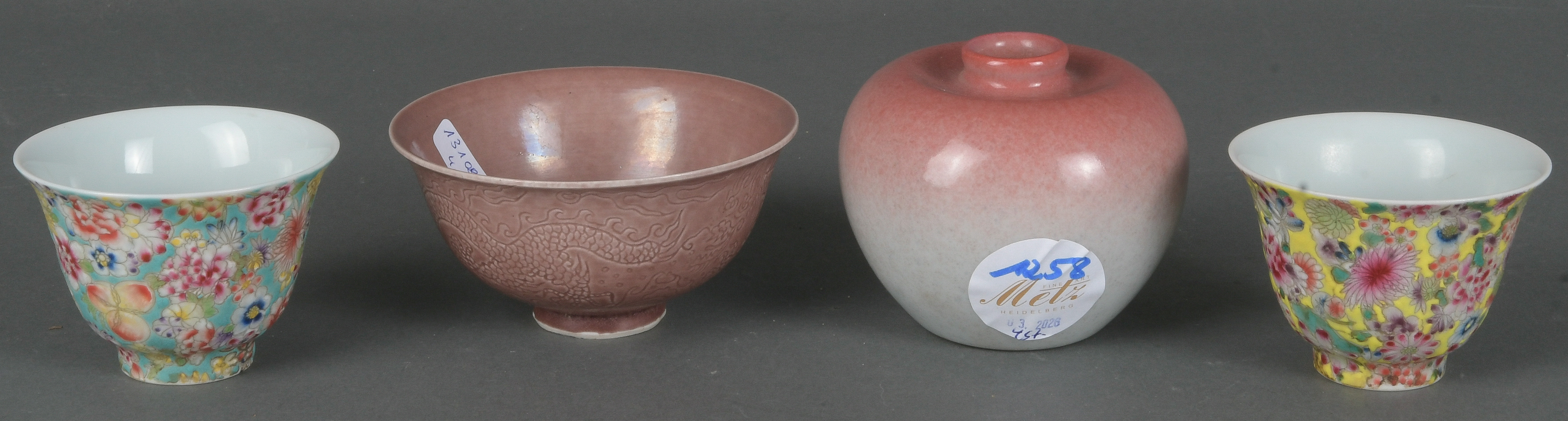 - Katalog-Nr: 1258Viertlgs. Konvolut Asiatika. Porzellan, am Boden gemarkt. Bestehend aus: Ein Paar Koppchen (H=4,5 cm, D=6,6 cm), eine Vase (H=6,2 cm) und eine Schale (H=4,5 cm, D=9 cm).o.L.