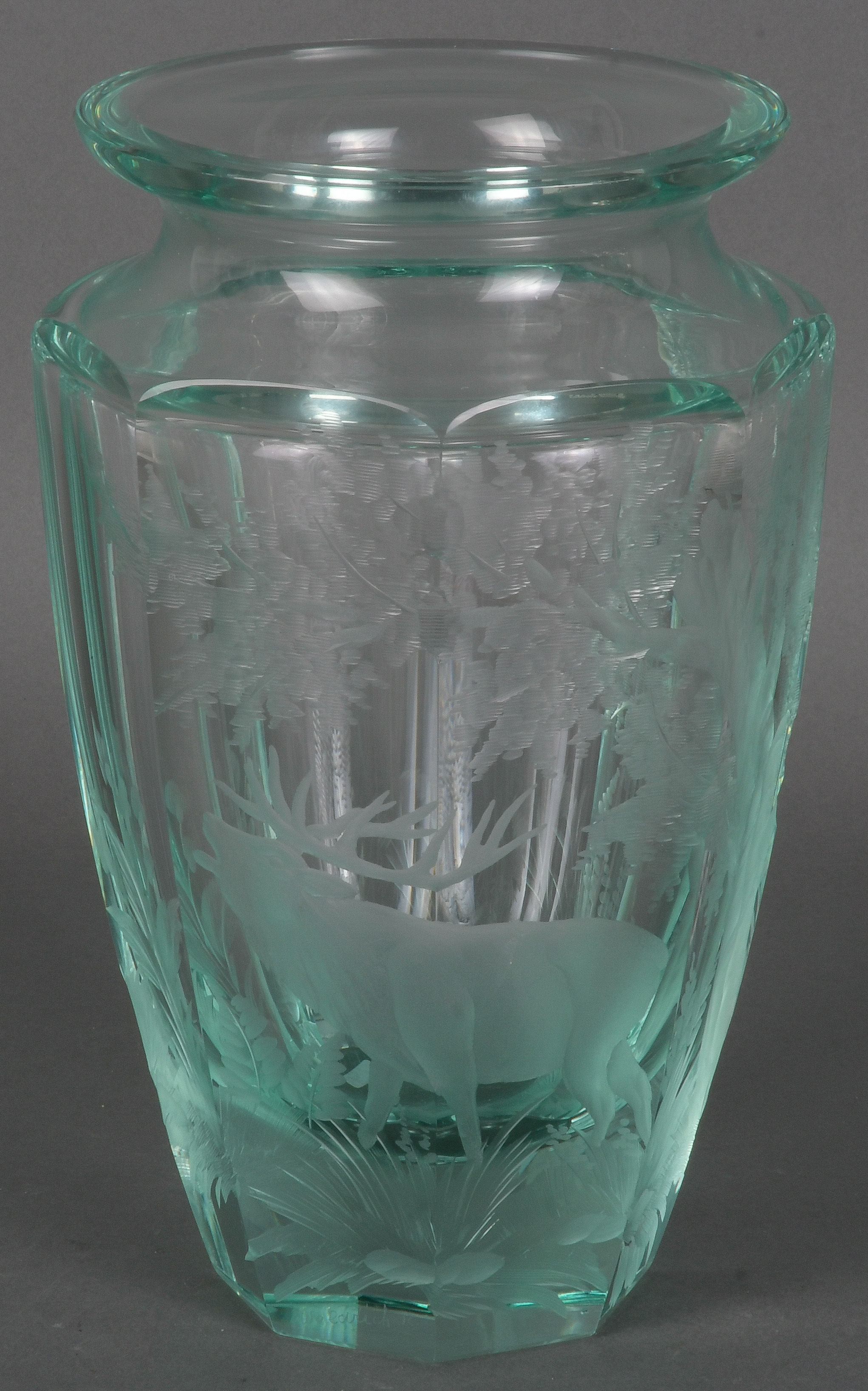 - Katalog-Nr: 1260Vase. Karlsbad, Moser 20. Jh. Farbloses Glas, geschliffen und geätzt mit röhrendem Hirsch; am Boden Ätzsignatur, H=21 cm.o.L.