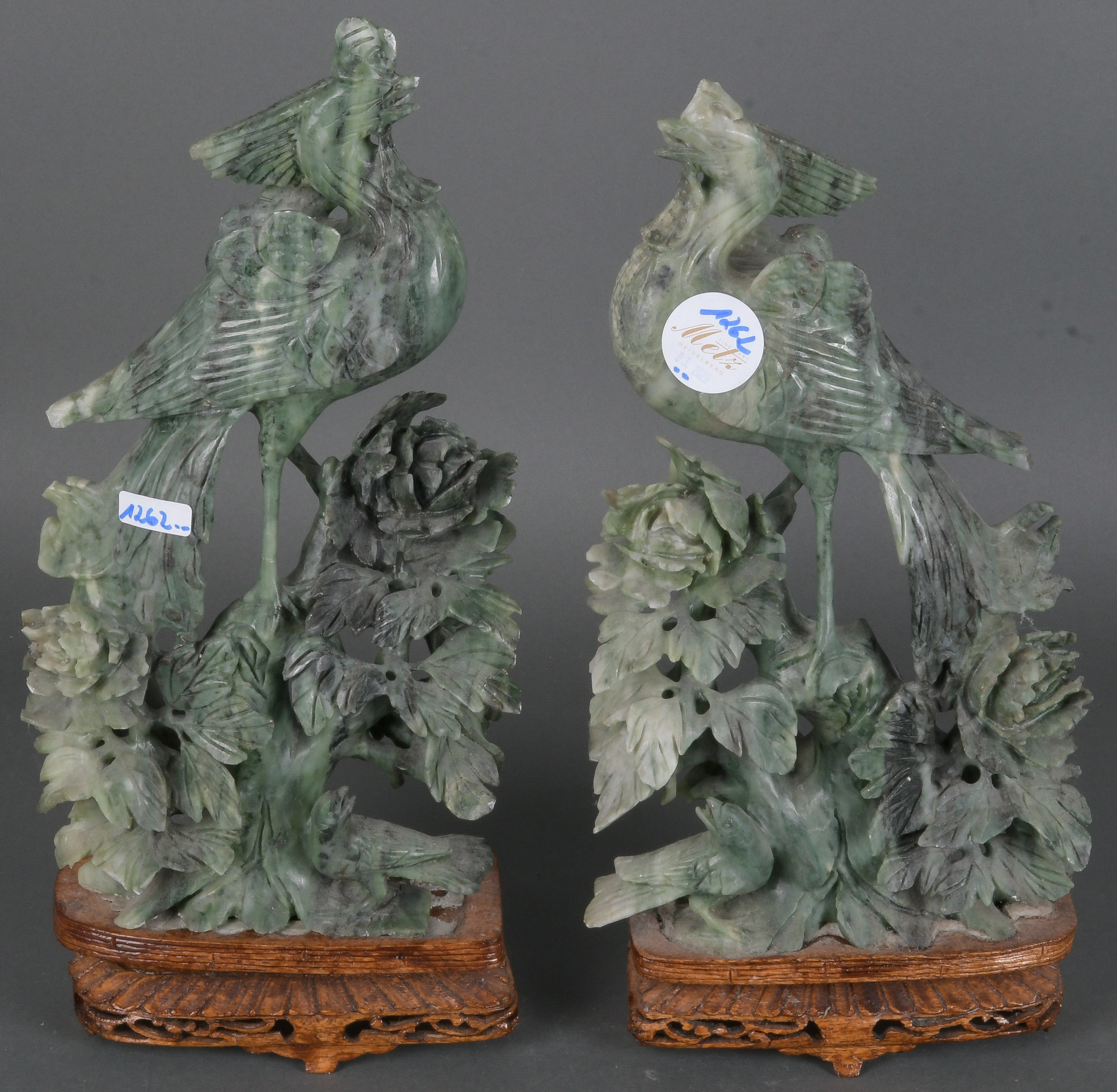 - Katalog-Nr: 1262Paar Paradiesvögel auf Blütenzweigen. Asien. Grüne Jade, exzellent geschnitzt, teilw. poliert, auf Holzsockel, H=29 / 33,5 cm. (best. / besch.)o.L.