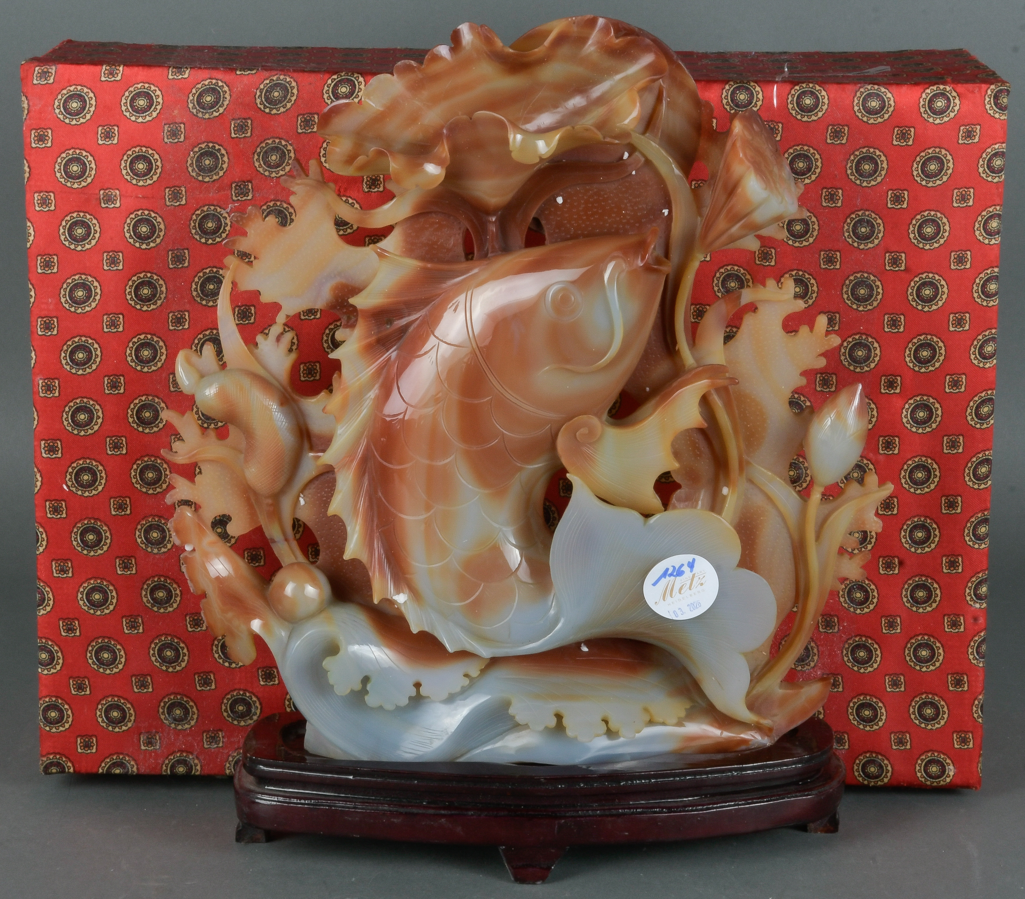 - Katalog-Nr: 1264Koi-Karpfen. Asien. Jade, exzellent geschnitzt und teilweise poliert, auf Holzsockel (H=31 / 35 cm); dazu Holzschatulle mit Stoffbezug (H=13 cm, B=40,5 cm, T=31 cm).o.L.