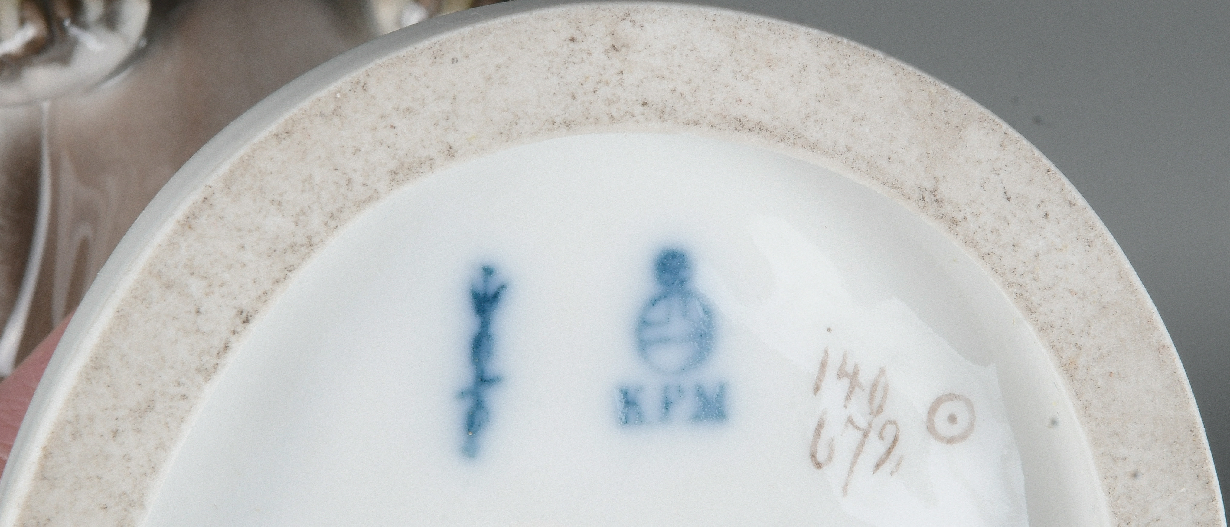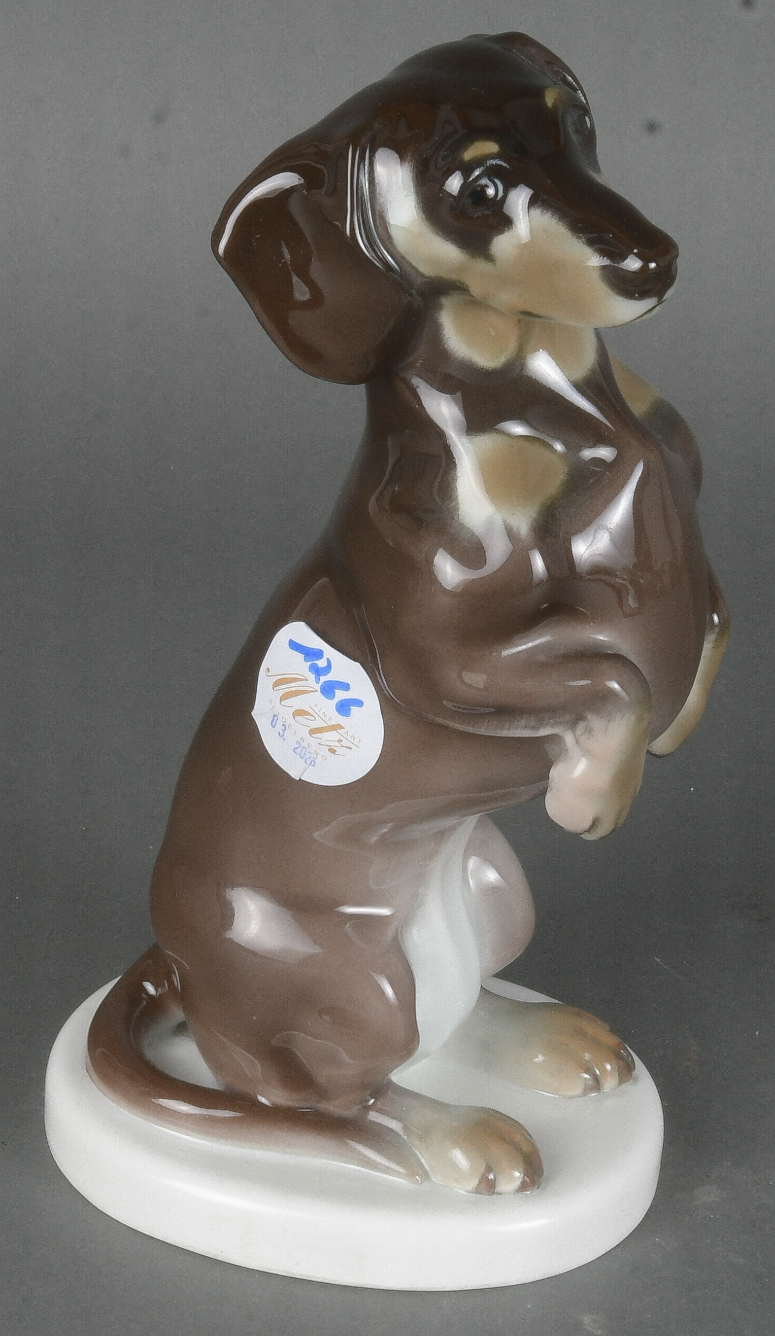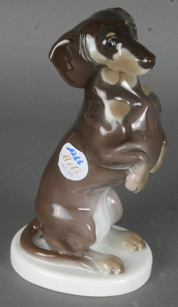 - Katalog-Nr: 1266Männchen machender Dackel. Berlin 20. Jh. Porzellan, bunt bemalt; am Boden gemarkt, Entwurf von Wilhelm Karl Roba, H=22,5 cm. (min. best.)o.L.
