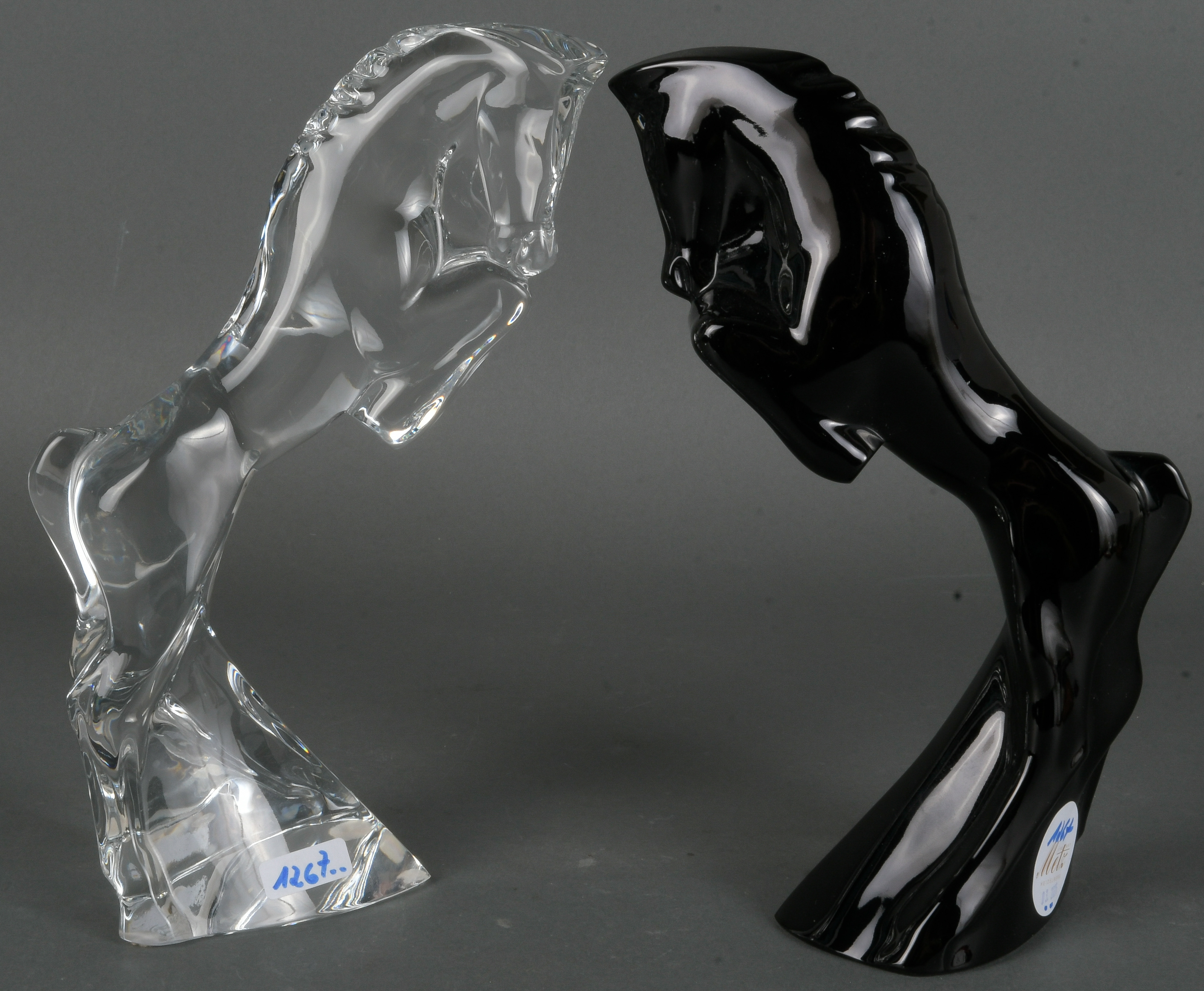 - Katalog-Nr: 1267Paar steigende Pferde. Frankreich, Baccarat 20. Jh. Farbloses und schwarzes Glas, am Boden Ätzsignatur, H=je 22,8 cm.o.L.