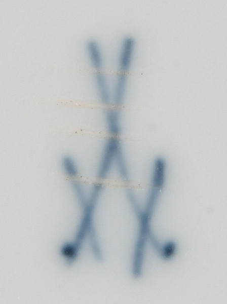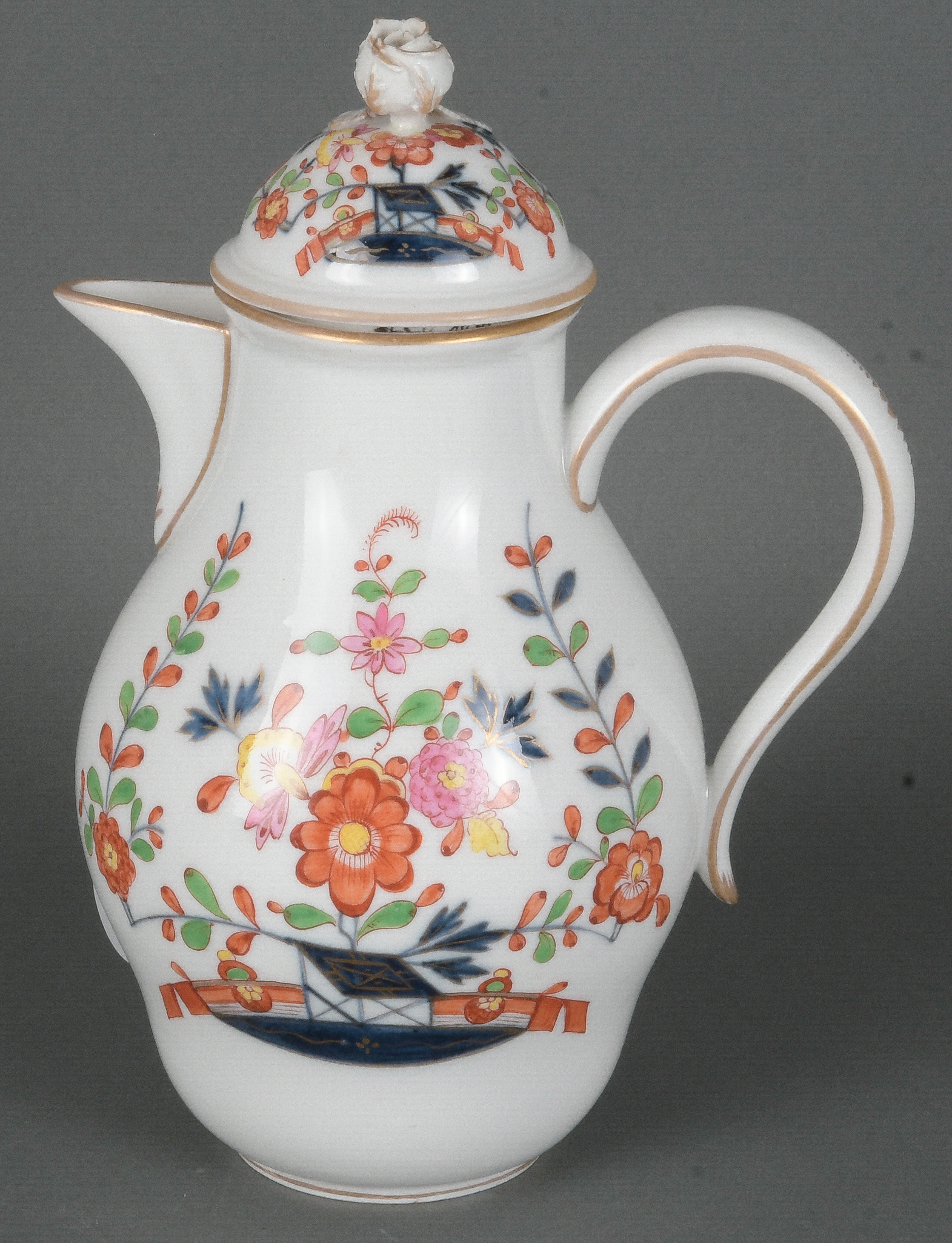 - Katalog-Nr: 1268Kanne „Tischchenmuster“. Meissen 19. Jh. Porzellan, bunt bemalt; am Boden unterglasurblaue Schwertermarke mit zwei Schleifstrichen, H=22,5 cm. (min. best.)o.L.