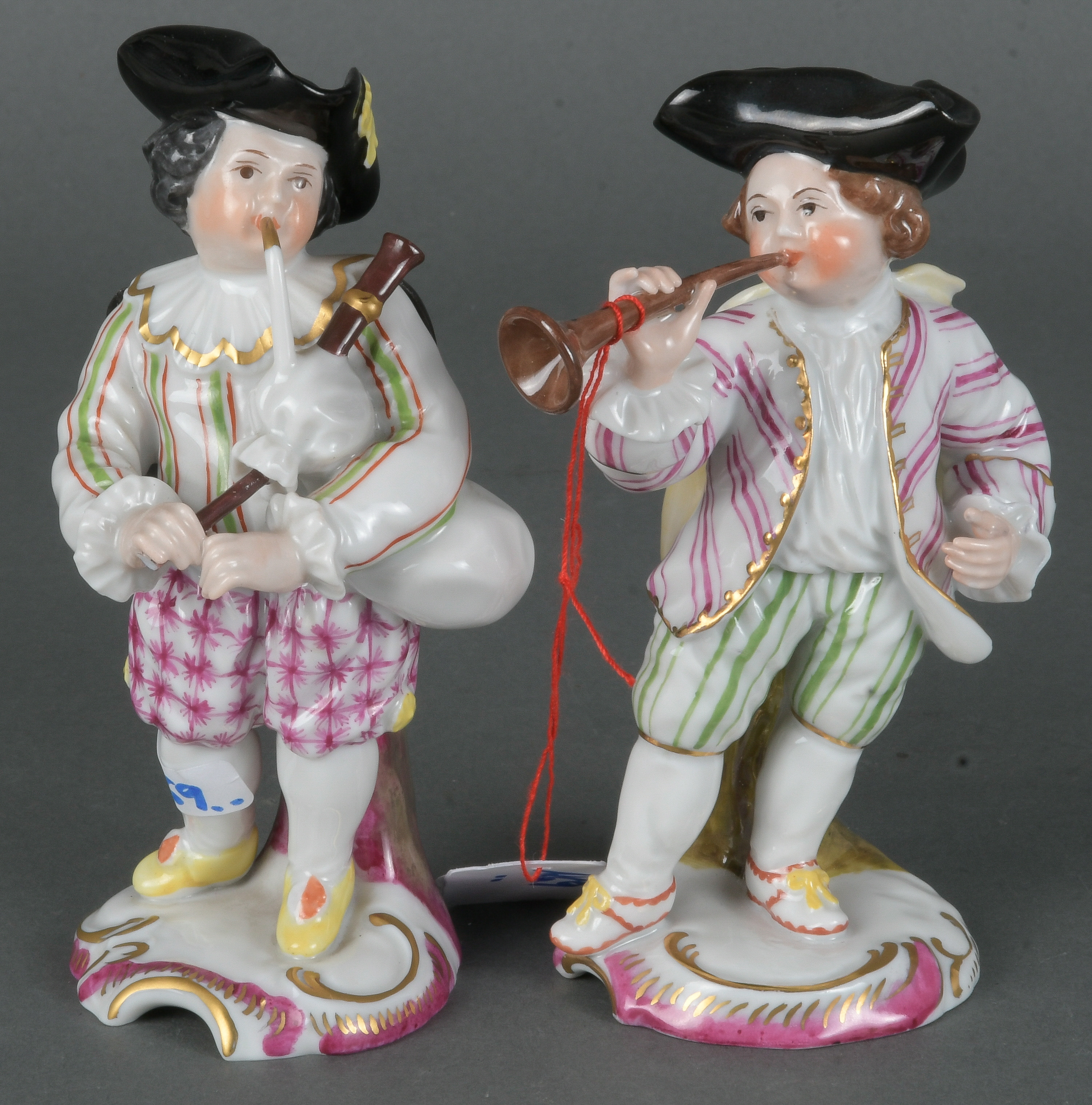 - Katalog-Nr: 1269Zwei Musikanten. Höchst 20. Jh. Porzellan, bunt bemalt; am Boden gemarkt, H=12,4 / 13 cm. (best.)o.L.