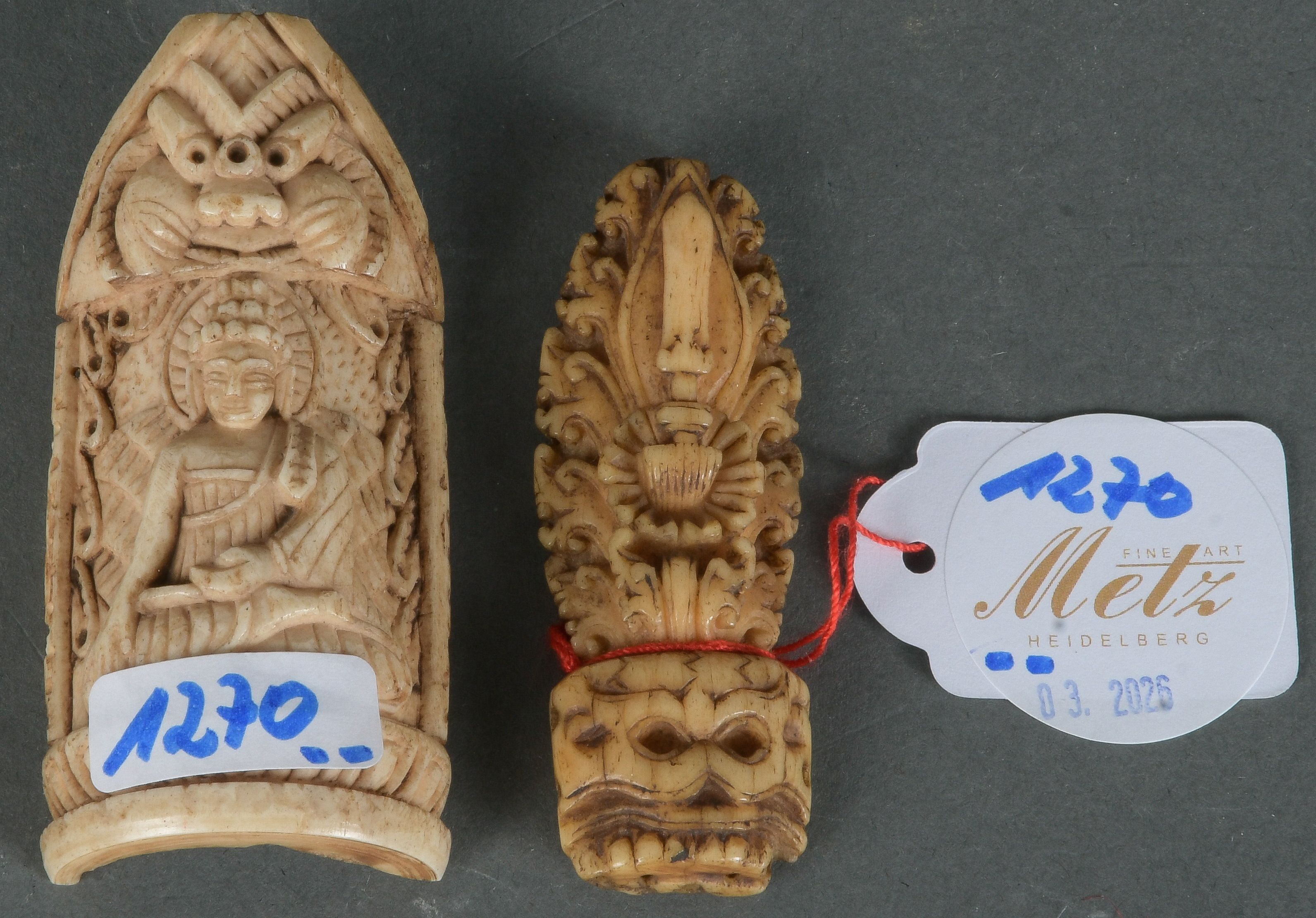 - Katalog-Nr: 1270Zweitlgs. Konvolut. Asien. Knochen und Horn, geschnitzt, H=6,4 / 7,3 cm.o.L.
