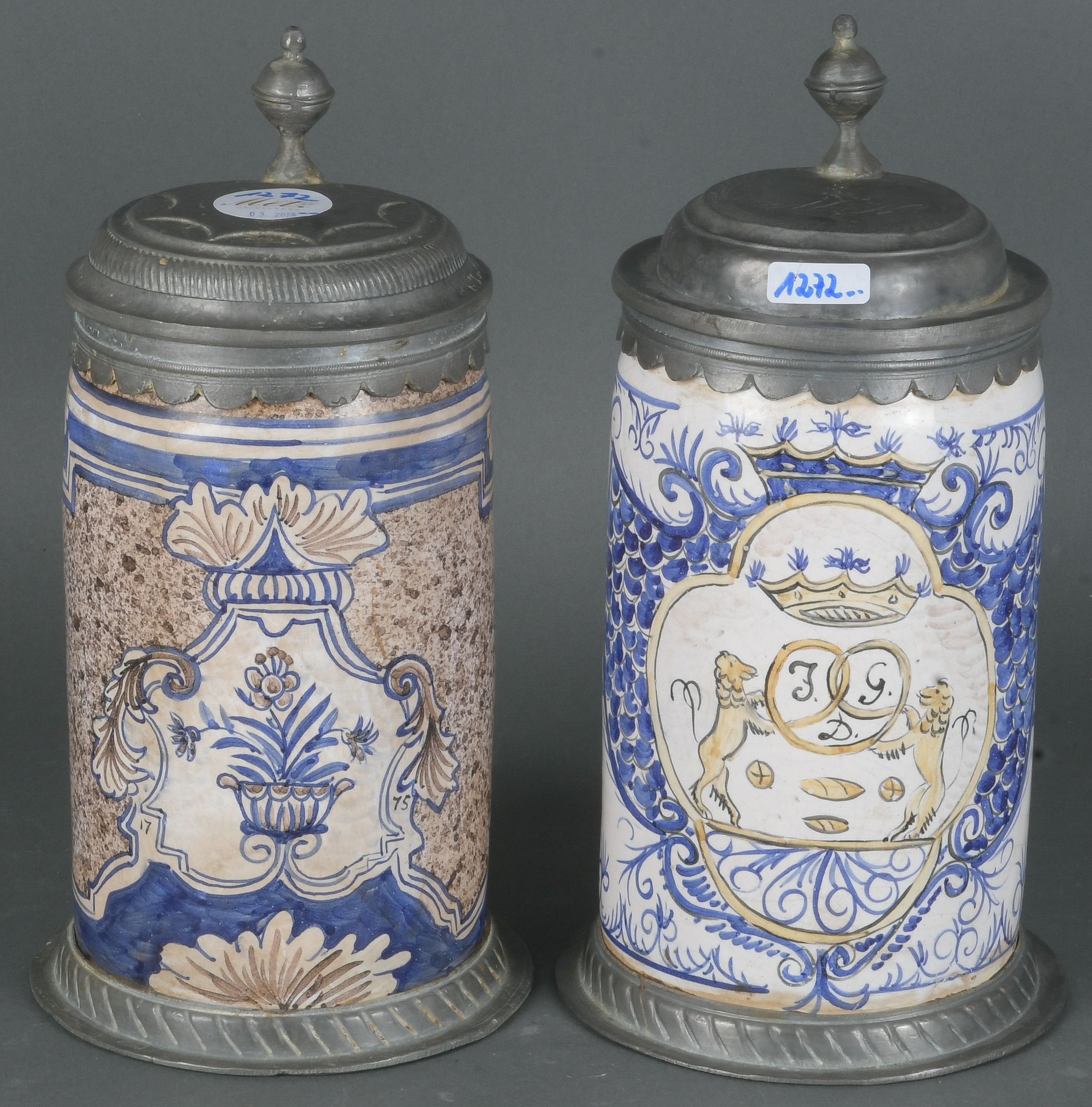 - Katalog-Nr: 1272Zwei Walzenkrüge. Wohl Bayreuth. Fayence, bunt bemalt u.a. mit dem bekrönten Zunftwappen der Bäcker, am Boden bez. „B.P.“ und „LB“, H=je 25,5 cm.o.L.