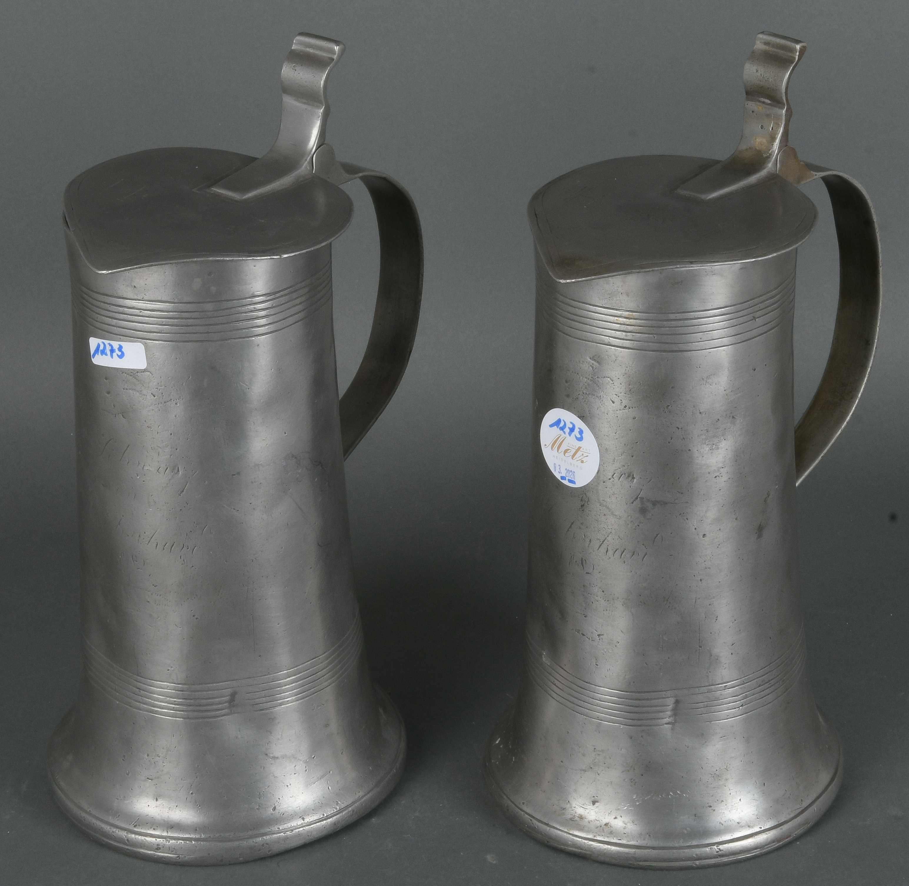 - Katalog-Nr: 1273Zwei Zinnkrüge. Deutschland 19. Jh. Je glockenförmig mit Bandhenkel und montiertem Deckel, H=29 / 29,5 cm.o.L.