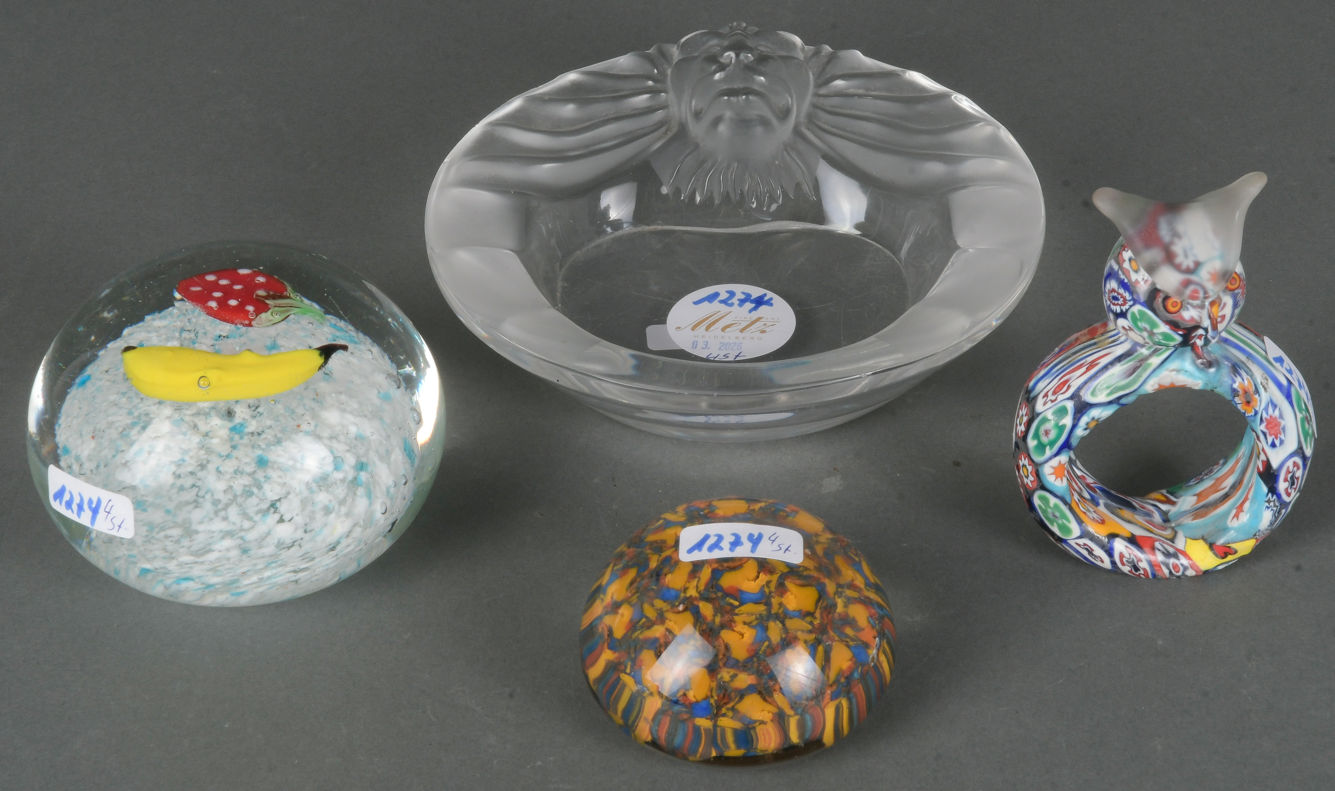 - Katalog-Nr: 1274Viertlgs. Konvolut Glas. Lalique / Murano 20. Jh. Glas, teilw. mit Einschmelzungen. Bestehend aus: Eine runde Schale (H=5 cm, D=14,5 cm), zwei Paperweights (H=4 cm, D=6,5 cm / H=6,3 cm, D=8,8 cm), und ein Serviettenring (H=9,8 cm, D=6,4 cm).o.L.