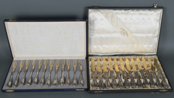 - Katalog-Nr: 1252Zwölf Obstmesser und -gabeln im Etui. Deutsch um 1900. 800er Silber, mit vergoldeten Zinken und Klingen.o.L.