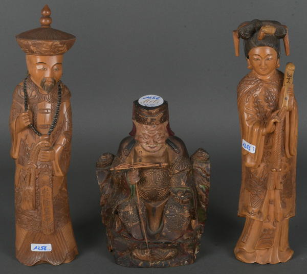 - Katalog-Nr: 1256Buddha und Kaiserpaar. Asien. Massivholz, geschnitzt, eine Figur farbig gefasst, H=21 / 31 / 34 cm.o.L.