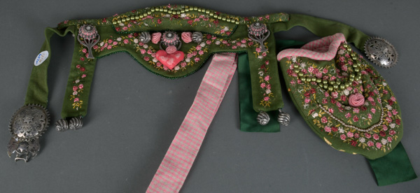 - Katalog-Nr: 1259Trachtengürtel für ein Dirndl. Alpenländisch. Stoff, floral farbig bestickt mit 925er Silberschließe und Applikationen.o.L.