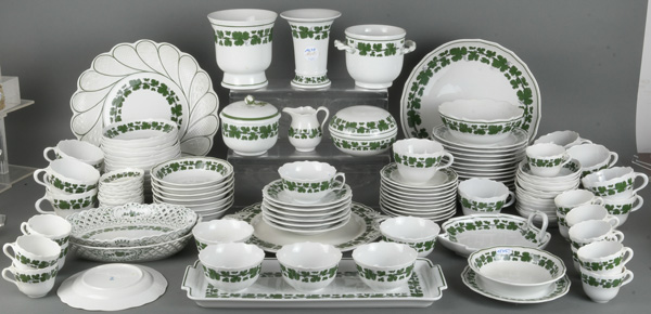 - Katalog-Nr: 127589-tlgs. Kaffeeservice „Weinblattdekor“. Meissen 20. Jh. Porzellan, bunt bemalt; am Boden unterglasurblaue Schwertermarke. Bestehend aus: Ein Milchgießer (H=8 cm), eine Zuckerdose (H=10,5 cm), zwölf Kaffeetassen mit 13 Unterschalen, 13 Mokkatassen mit Unterschalen, sechs Teetassen mit Unterschalen, zehn Kuchenteller (D=je 14 cm), zwei Teller (D=je 16,5 cm), ein Kuchentablett (38 x 14,5 cm), eine Blattschale (B=19 cm), eine Schale (H=6,5 cm, D=16 cm), eine Deckeldose (H=8 cm, D=12,5 cm), drei runde Platten (D=28 / 28,5 cm), acht Schälchen (D=je 15 cm), 13 Teller (D=je 18 cm), zwölf Schälchen (D=je 8 cm), eine Vase (H=13,5 cm) und zwei Cachepot (H=10,5 cm, D=11,5 cm / H=13,5 cm, D=13,5 cm). (teilw. min. best.)o.L.
