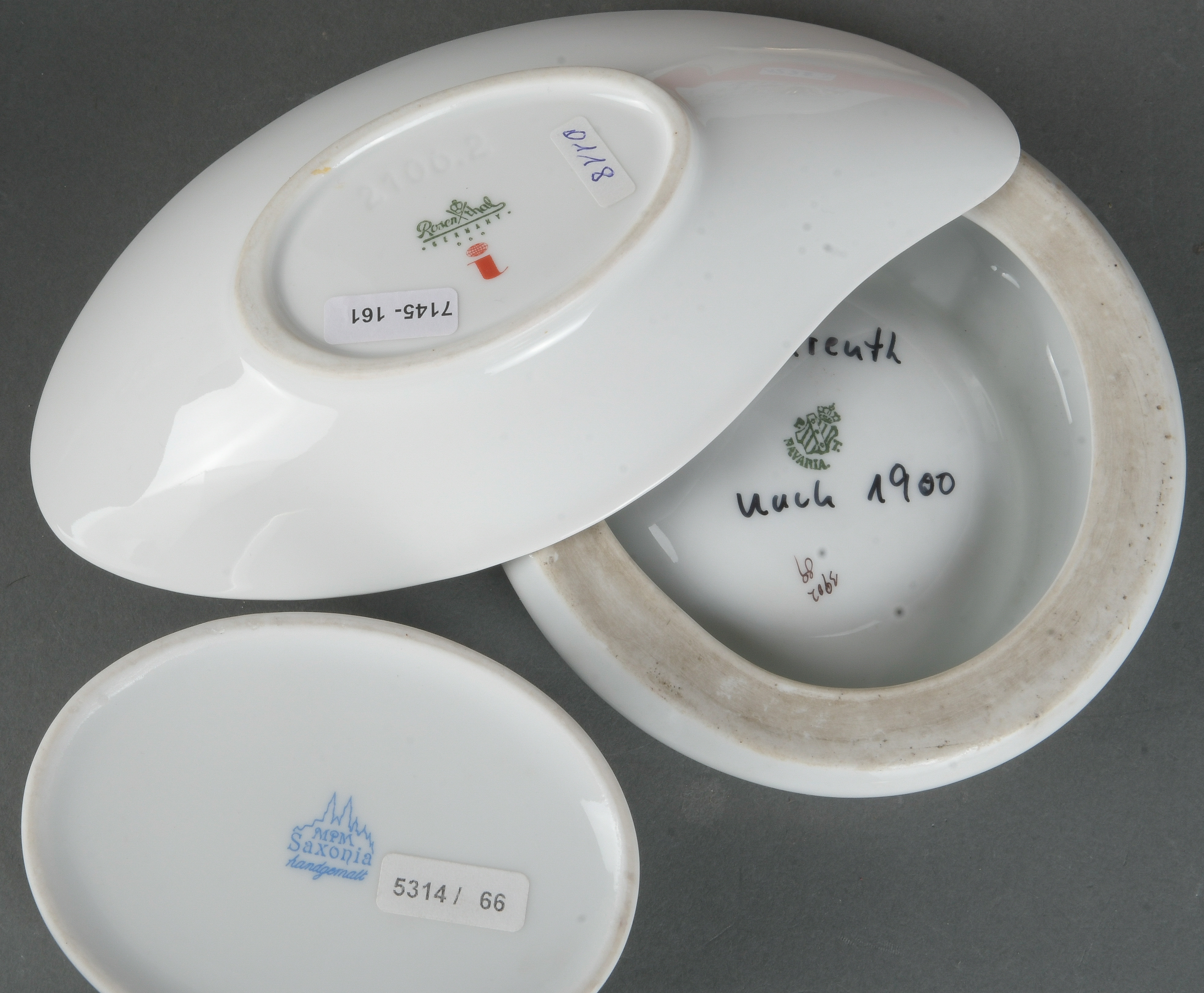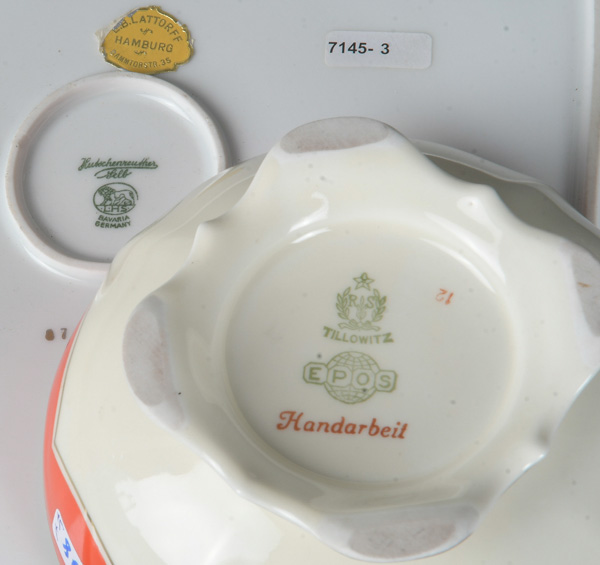 - Katalog-Nr: 1278Siebentlgs. Konvolut. Hutschenreuther / Rosenthal / Tillowitz / Tirschenreuth 20. Jh. Porzellan, bunt bemalt bzw. dekoriert; am Boden gemarkt. Bestehend aus: Ein Tablett (H=5 cm, B=30 cm, T=31 cm), drei Schalen (B=21 bis 27 cm), ein Aschenbecher (D=13 cm) und zwei Deckeldosen (H=5,5 / 10,5 cm).o.L.