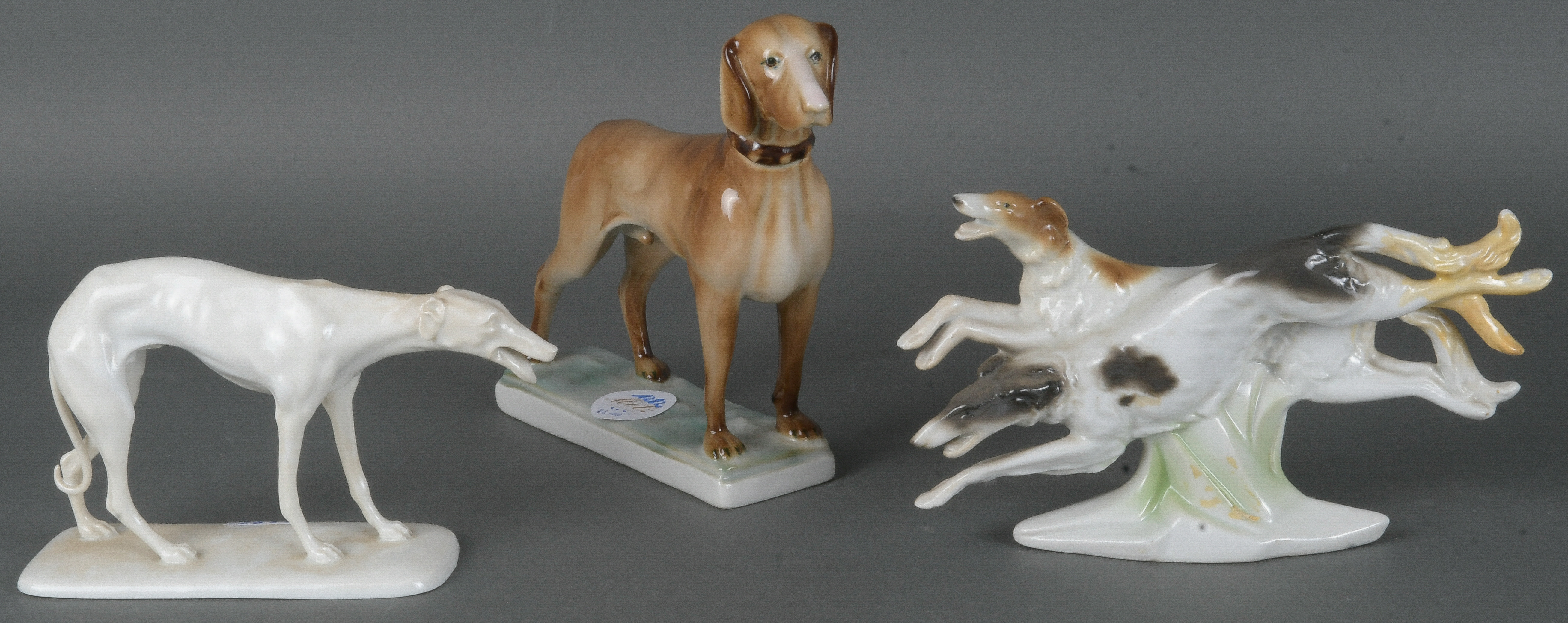 - Katalog-Nr: 1282Drei Hundefiguren. Fraureuth / Ungarn / Wien 20. Jh. Porzellan, bunt bemalt / weiß glasiert; am Boden gemarkt. Bestehend aus: Afghanische Windhunde (H=11,5 cm / rest.), Jagdhund (H=16 cm) und Windhund (H=10 cm).o.L.