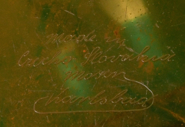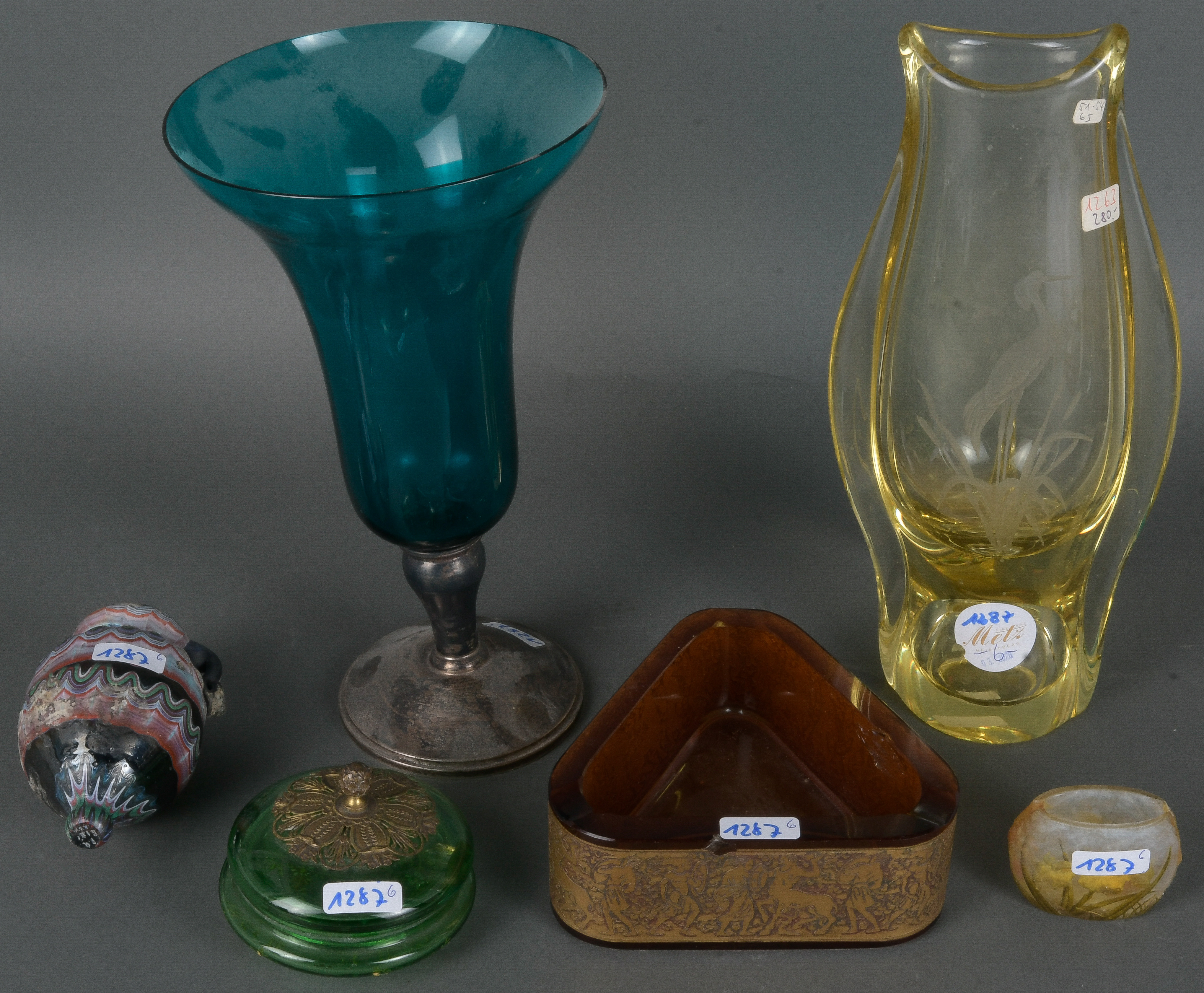 - Katalog-Nr: 1287Aschenbecher. Karlsbad, Moser 20. Jh. Honigfarbenes Glas mit breiter Goldbordüre eines Kentaurenkampfes (H=5 cm, B=12,5 cm / best.); dazu Deckeldose, Kelchvase mit Silberfuß, Vase mit Kranichdekor und Miniatur-Vase.o.L.