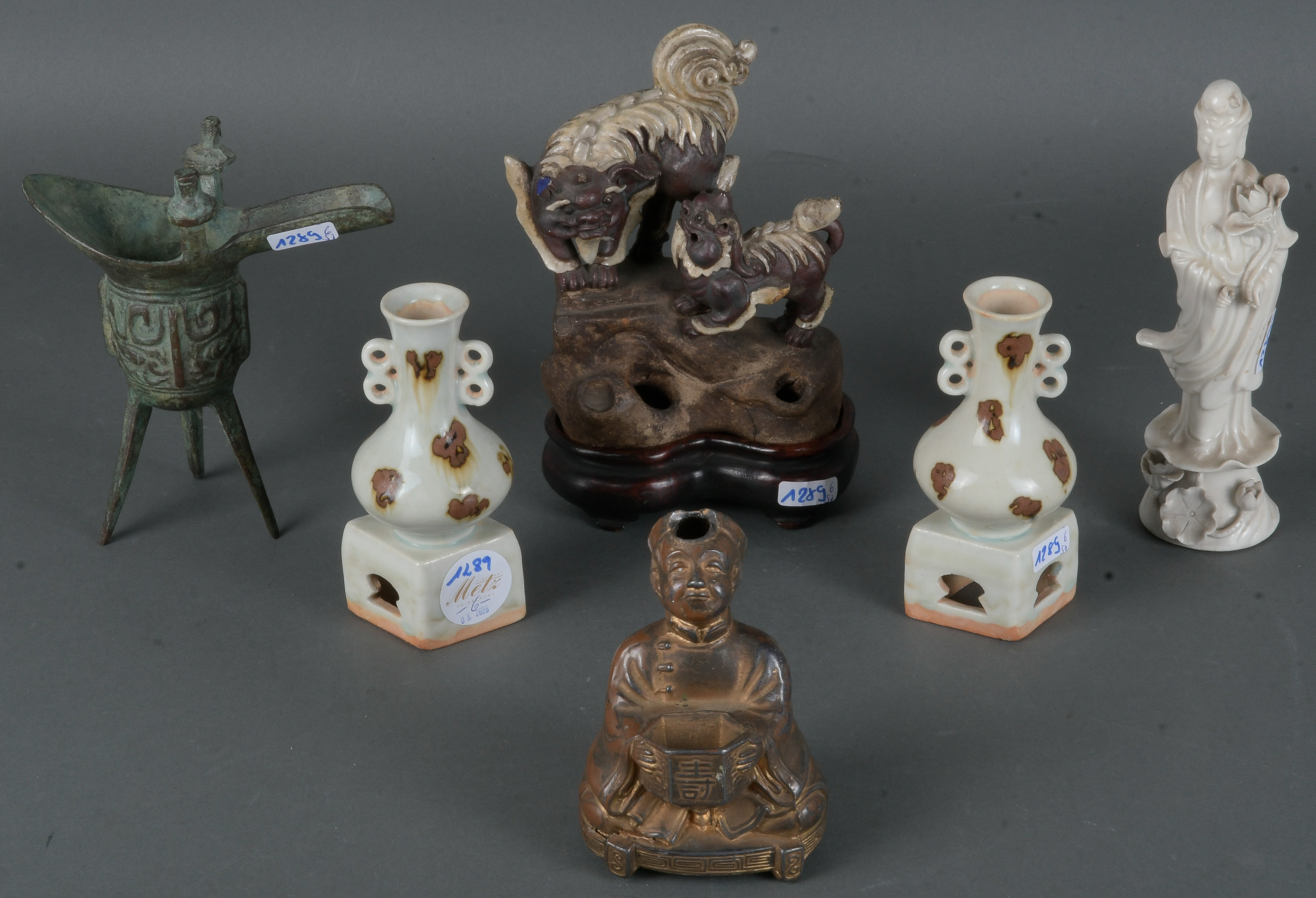 - Katalog-Nr: 1289Sechstlgs. Konvolut Asiatika: Ein Paar durchbrochene Keramikväschen auf Sockel (H=13 cm), eine Foh-Hundegruppe auf Fels (H=19 cm), ein Bronze-Dreifuß (H=16 cm), eine Buddha-Statue (H=11 cm) und eine Porzellan-Guanyinfigur (H=18,5 cm).o.L.