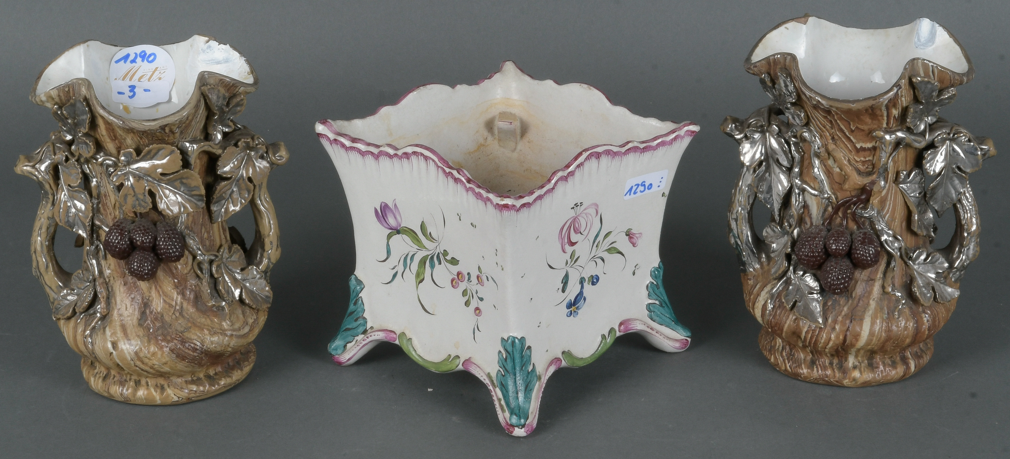 - Katalog-Nr: 1290Paar Doppelhenkelvasen. Mettlach, Villeroy & Boch 19. Jh. Feinsteinzeug, mit Brombeer-Reliefdekor und Silberauflage (H=15 cm / besch.); dazu ein Fayence-Cachepot (H=11 cm).o.L.