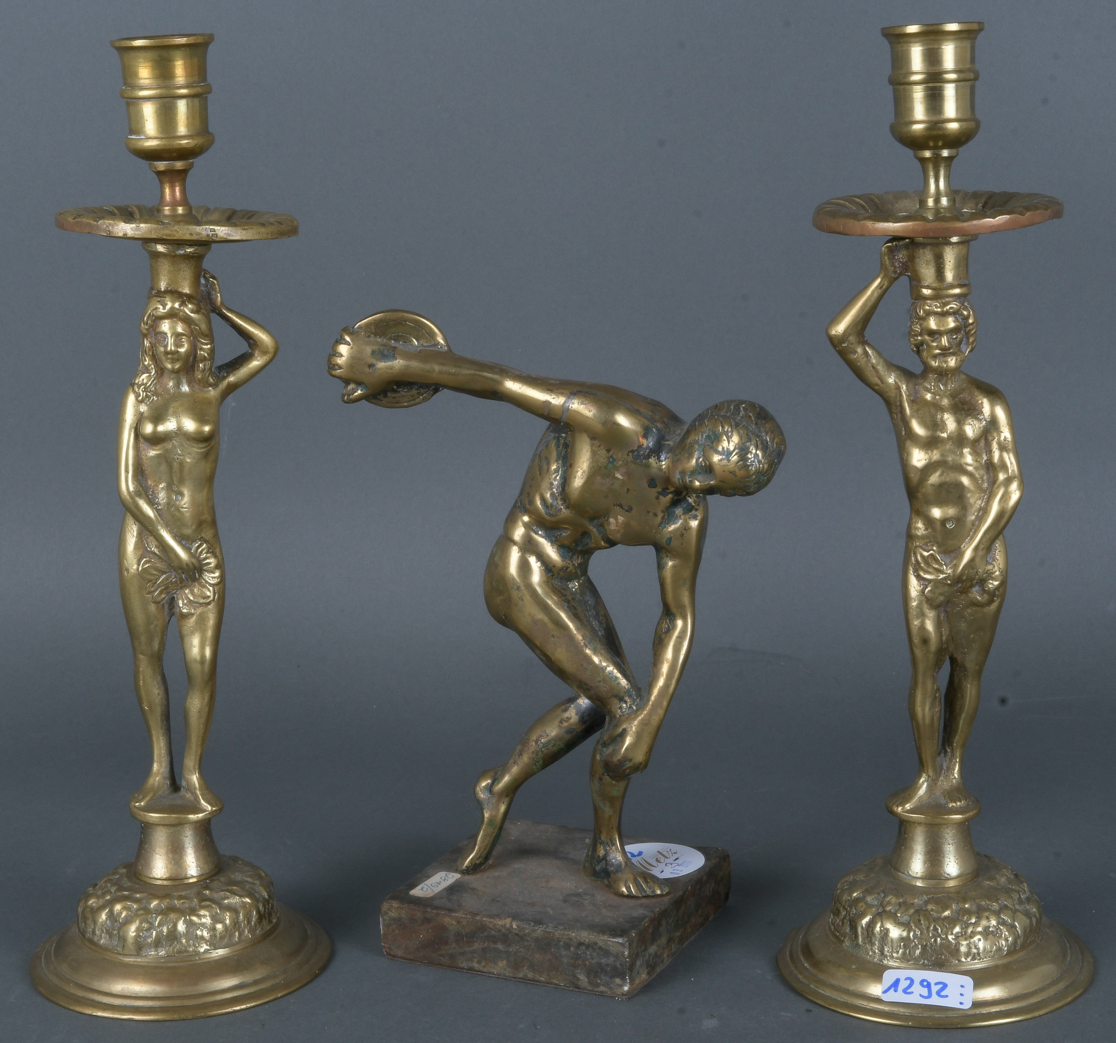 - Katalog-Nr: 1292Paar Kerzenleuchter „Adam & Eva“ und Diskuswerfer. Deutsch 20. Jh. Bronze, H=27 / 19,5 cm.o.L.
