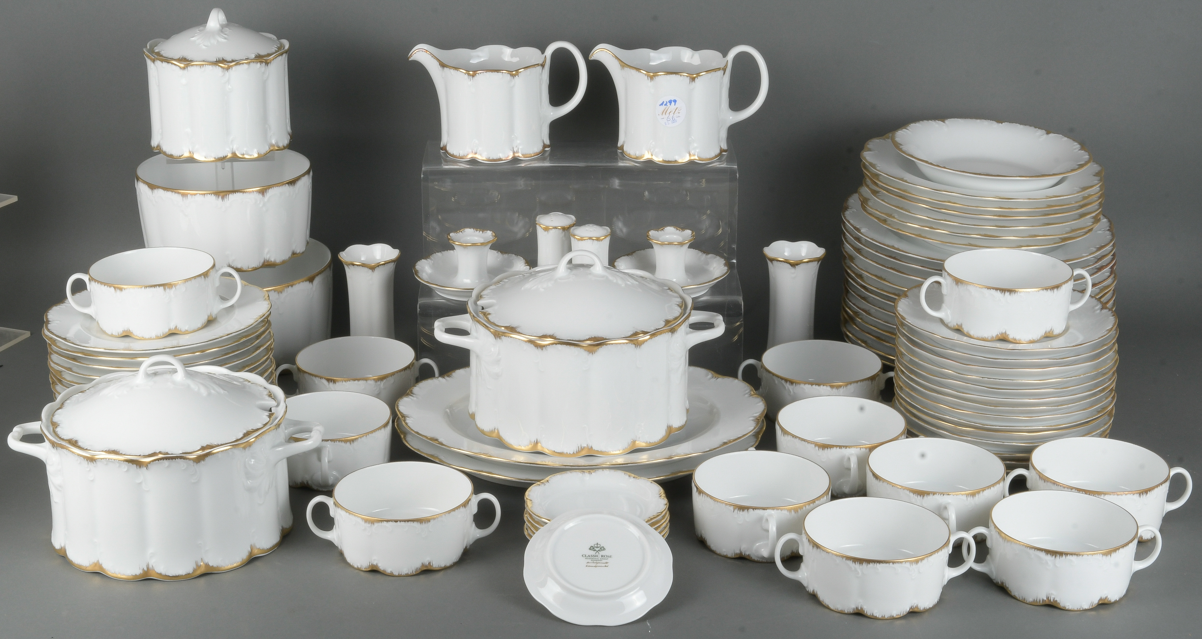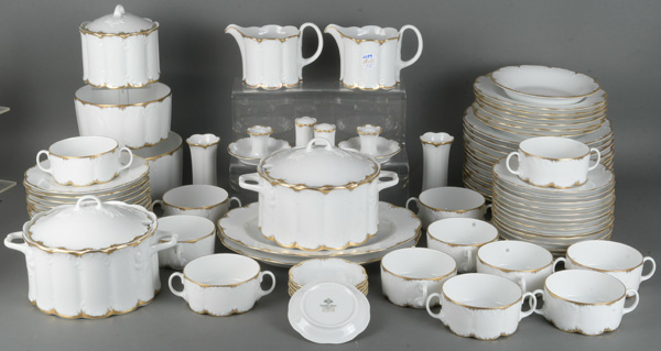 - Katalog-Nr: 129966-tlgs. Service. Rosenthal 20. Jh. Porzellan, weiß glasiert mit gerippter, sparsam rocaillereliefierter Wandung und Goldrand; am Boden gemarkt.o.L.