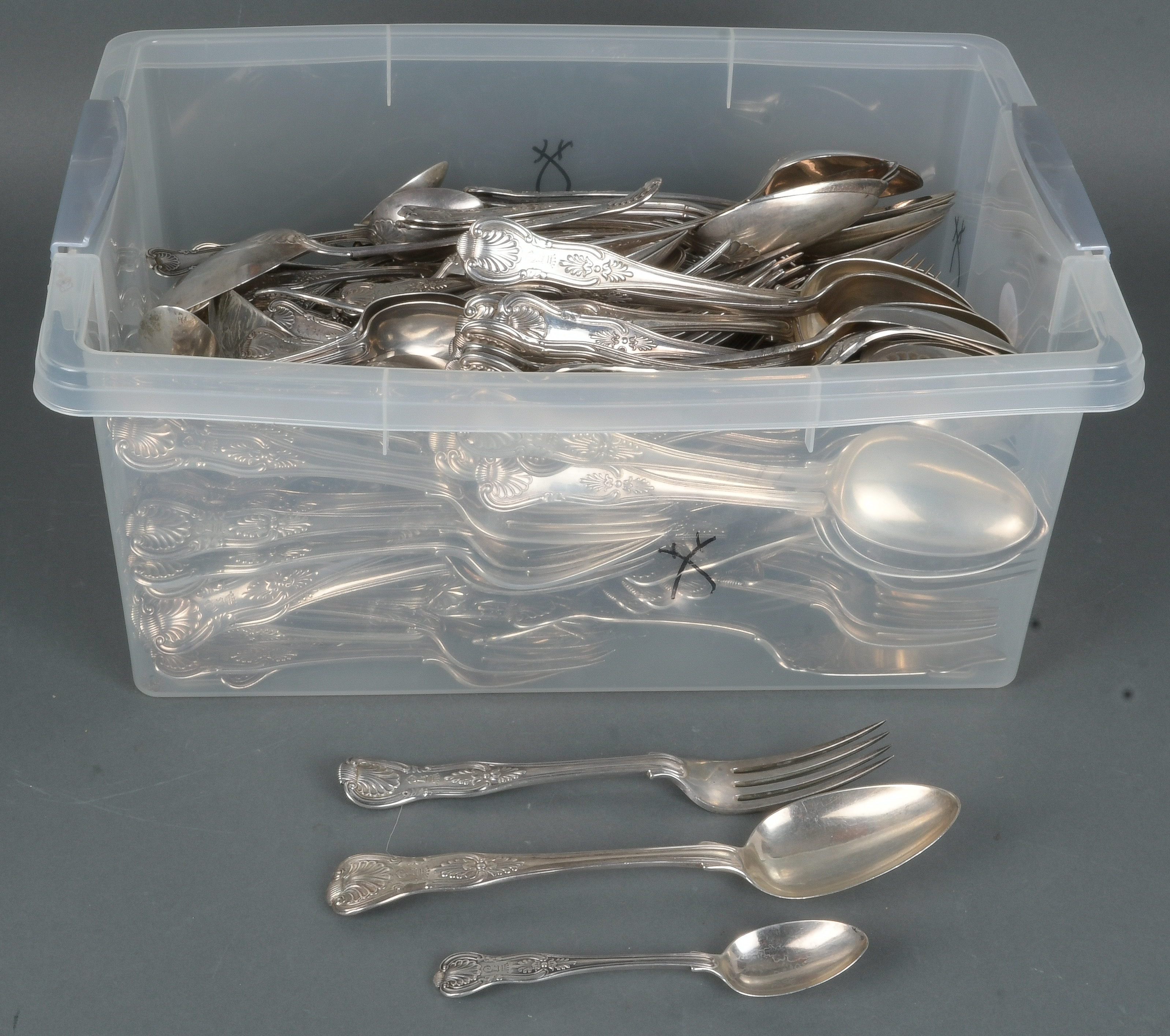 - Katalog-Nr: 1300224-tlgs. Speisebesteck. England 20. Jh. Bestehend aus: Eine Suppenkelle, 48 Gabeln (L=17,5 cm), 50 Gabeln (L=20,5 cm), 48 Suppenlöffel, 36 Suppenlöffel, 32 Dessertlöffel, neun Vorlegeteile, u.a. 800er und 925er Sterlingsilber, ca. 16.400 g, reliefiert mit Muscheldekor und ziseliert mit bekröntem „J“.o.L.