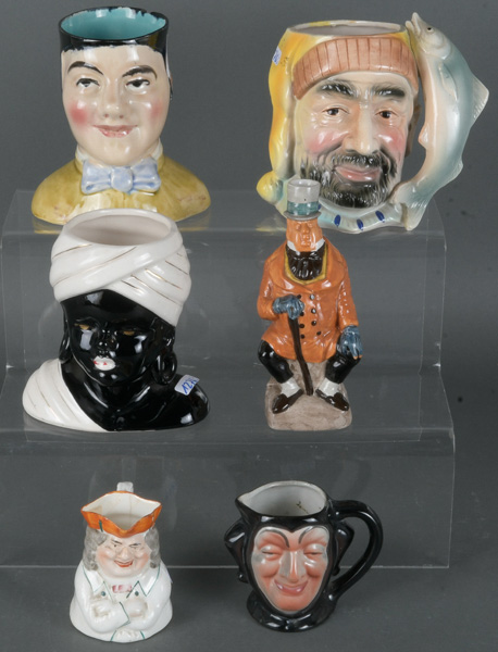 - Katalog-Nr: 1276Fünf Becher in Kopfform und einer in Figurenform. England / Frankreich 20. Jh. Feinsteinzeug / Keramik, bunt glasiert, teilw. gemarkt, H=7,5 bis 15,5 cm.o.L.