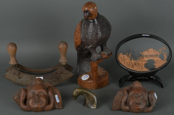 - Katalog-Nr: 1277Konvolut Dekorationsartikel, u.a. Afrika / Asien. Bestehend aus: Papagei und zwei Puttenköpfe, je Massivholz geschnitzt, Miniaturschnitzerei in Kasten, ein doppelscheidiges Wiegemesser und ein Messing-Pferdekopf als Beschlag, H=8 bis 33,5 cm.o.L.