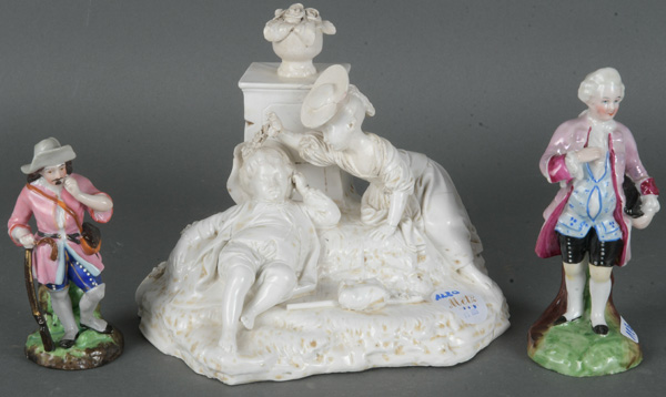 - Katalog-Nr: 1280„Der bekränzte Schäfer“. Höchst 18. Jh. Porzellan, weiß glasiert, am Boden gemarkt, Modell von Johann Peter Melchior (H=15 cm / besch.); dazu zwei weitere Porzellanfiguren, ohne Marke, H=11 / 14 cm.o.L.