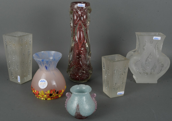 - Katalog-Nr: 1281Sechs unterschiedliche Vasen, u.a. Murano 20. Jh. Farbloses Glas, farbig überfangen, teilw. mit eingeschmolzenen Silberflocken / Aufschmelzungen bzw. blattförmig geschliffen, H=8,5 bis 29 cm.o.L.