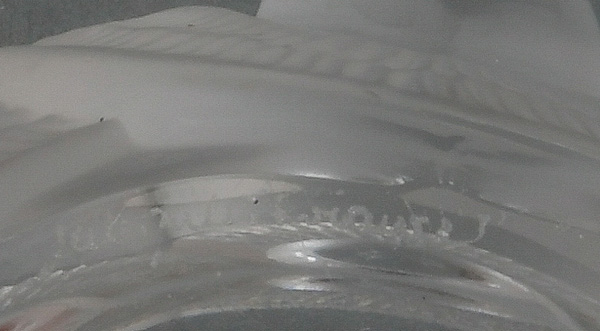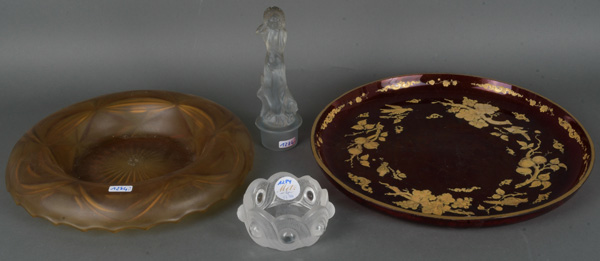 - Katalog-Nr: 1284Viertlgs. Konvolut Glas, u.a. Lalique 20. Jh. Bestehend aus: Eine runde Klarglasschale mit Wellenbanddekor, am Boden sign. (D=11 cm), eine honigfarbene Schale (H=4 cm, D=31 cm), ein rubinrotes Tablett mit Traubendekor (H=3 cm, D=35 cm) und ein Flaschenstöpsel als Venus (H=19 cm).o.L.