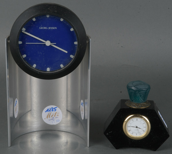 - Katalog-Nr: 1285Zwei Designer-Uhren, eine gemarkt Georg Jensen, H=9 / 20 cm. (Funktion ungeprüft)o.L.