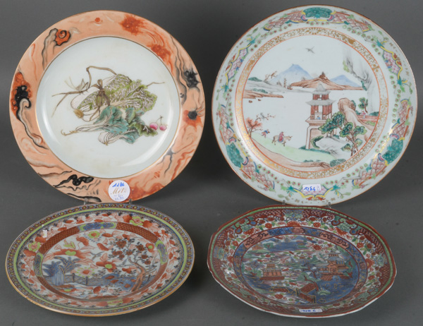 - Katalog-Nr: 1286Vier unterschiedliche Teller. Asien. Porzellan, bunt bemalt mit Floraldekor, Gemüsebouquet und Landschaft; einer verso mit Stempelmarke, D=23 bis 28 cm.o.L.