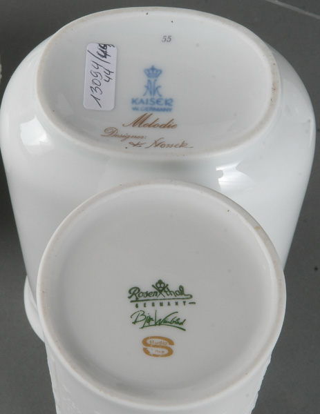 - Katalog-Nr: 1291Neun unterschiedliche Vasen. Kaiser / Rosenthal 20. Jh. Porzellan, teilw. weiß glasiert / gold bemalt, eine sign. K. Nossek; am Boden gemarkt, H=15 bis 24 cm.o.L.