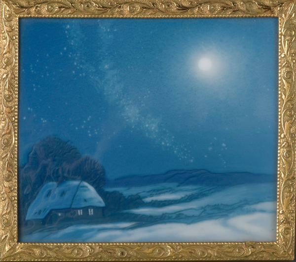 - Katalog-Nr: 1294Plakette „Weihnachtsstimmung“. Rosenthal 20. Jh. Porzellan, bunt bemalt, in fein reliefiertem Bronzerahmen, verso mit Lederaufsteller, gemarkt und bez., 8,2 x 9,2 cm.o.L.