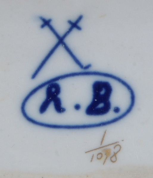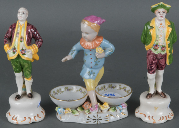- Katalog-Nr: 1296Drei Porzellanfiguren, u.a. Putto mit Gewürzschälchen; eine am Boden mit gekreuzten Schwertern mit „R.B.“, H=14 bis 16,5 cm. (best.)o.L.